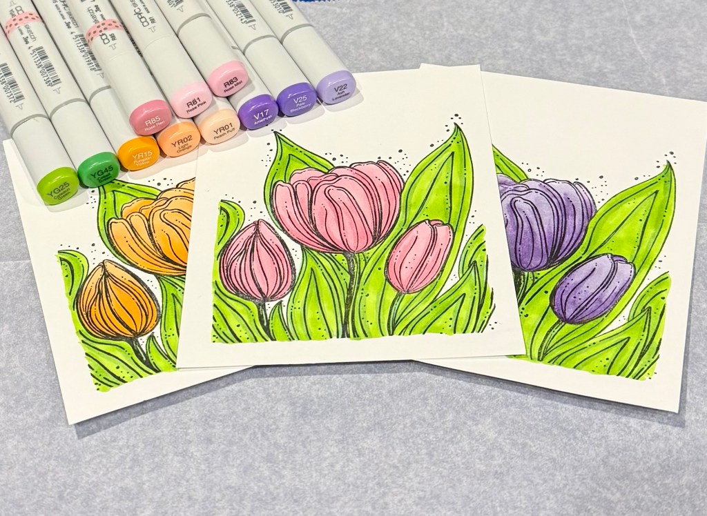 I stamped the tulip images with Memento Tuxedo Black ink on white card stock and colored them with Copic markers.