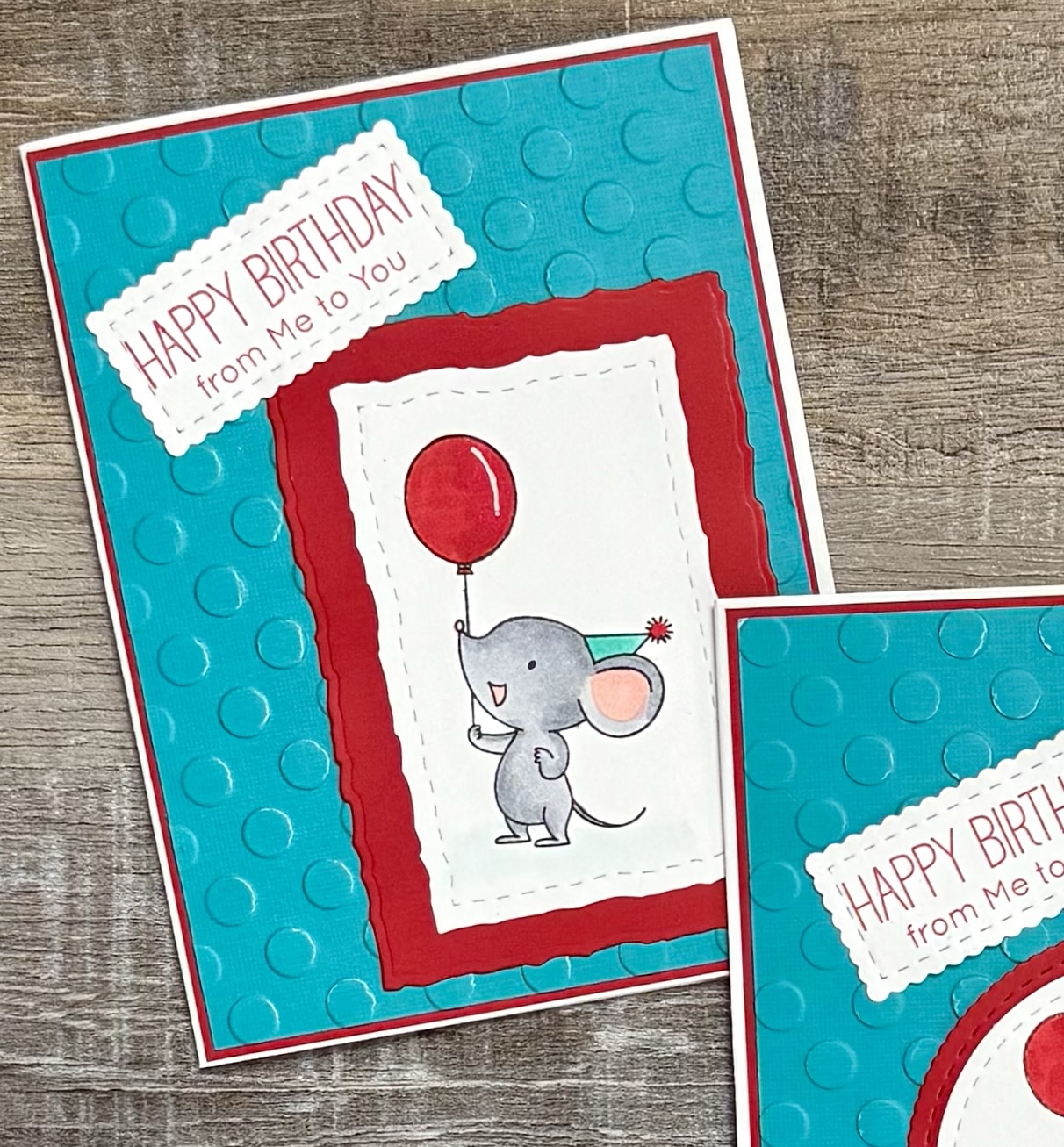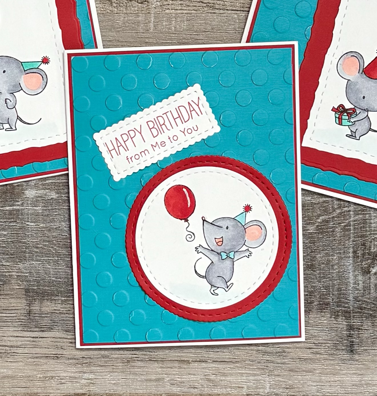 To make the cards, I embossed a piece of turquoise card stock with a circle embossing folder (similar to this), layered it to red card stock, and attached it to a white card. The mice images are attached to the card with the sentiment attached at an angle. (FYI, This is my favorite adhesive for card making and these are the refills.)