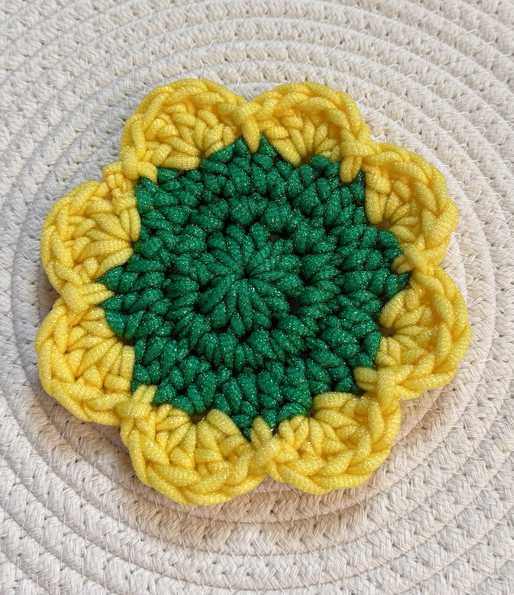 I had some Scrub-ology Scrub It! yarn leftover from a previous project that I wanted to put to good use. So I created a simple Spring Flower Dish Scrubby crochet pattern and I’ve shared it below.