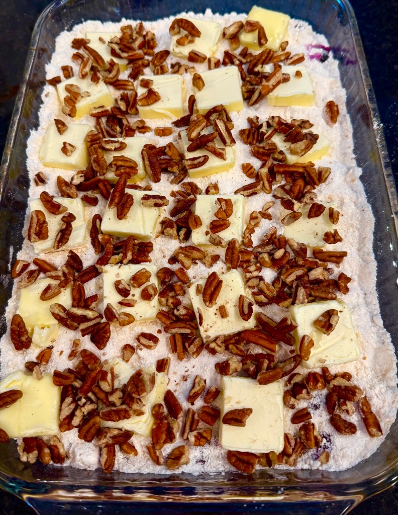 Sprinkle cake mix over the layers, then sprinkle with the 1/4 cup sugar. Slice butter and place all over the top. Sprinkle with pecans.