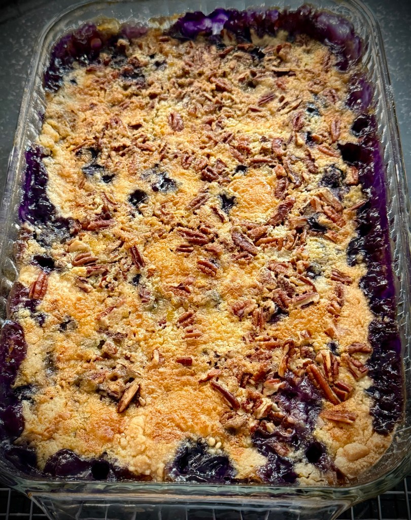 You can make it with fresh or frozen blueberries. It’s baked in a 9×13 inch pan so there is plenty to share – but you may not want to! π