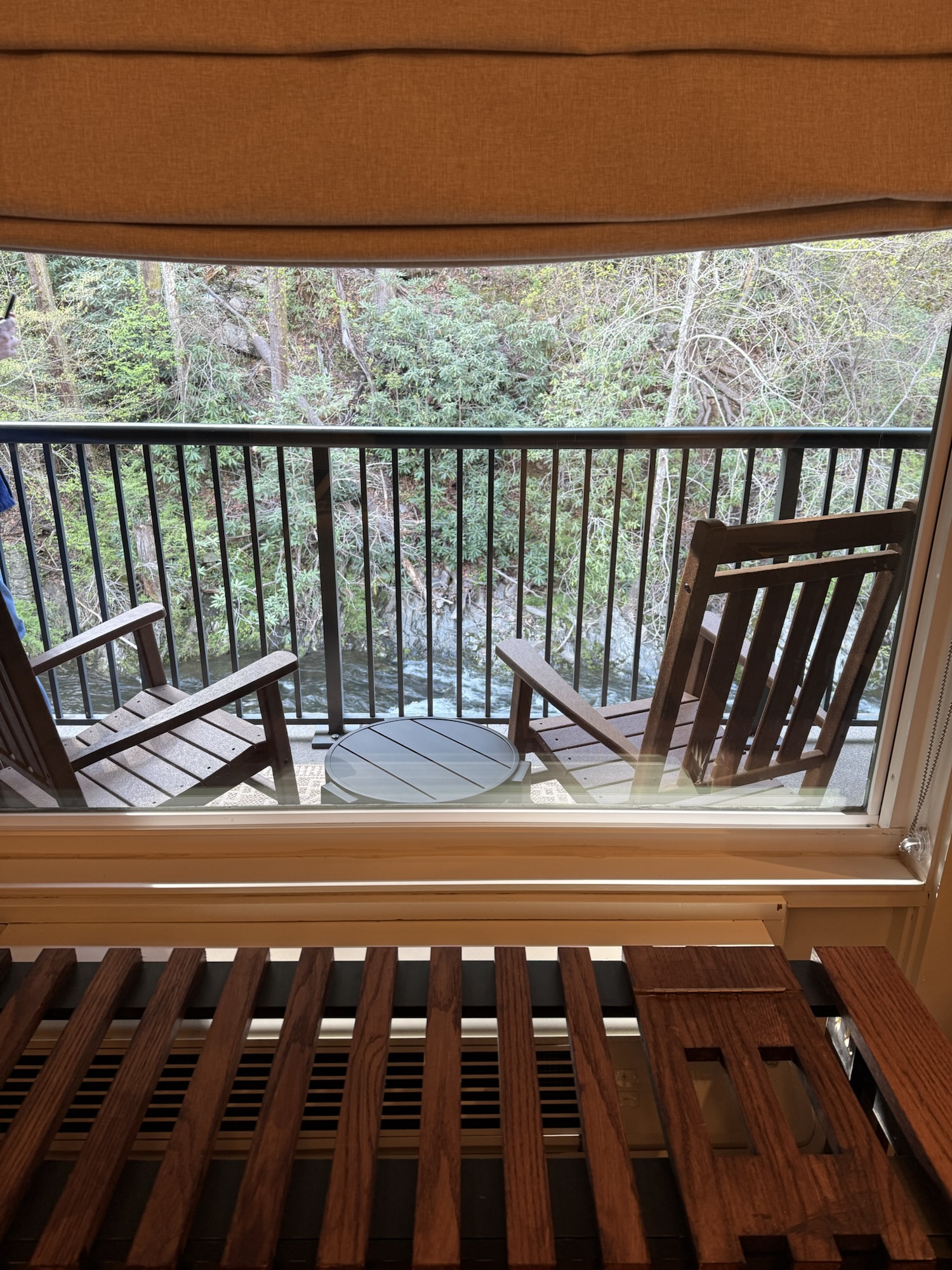 We stayed at the Historic Rocky Waters Inn which was a new place for us. It dates back to 1935, but no worries, it is completely updated and beautiful. 😉 We had a wonderful room with a king bed and balcony overlooking the Little Pigeon River. The balcony had 2 rocking chairs, a little table, and an outdoor rug. It was just perfect!