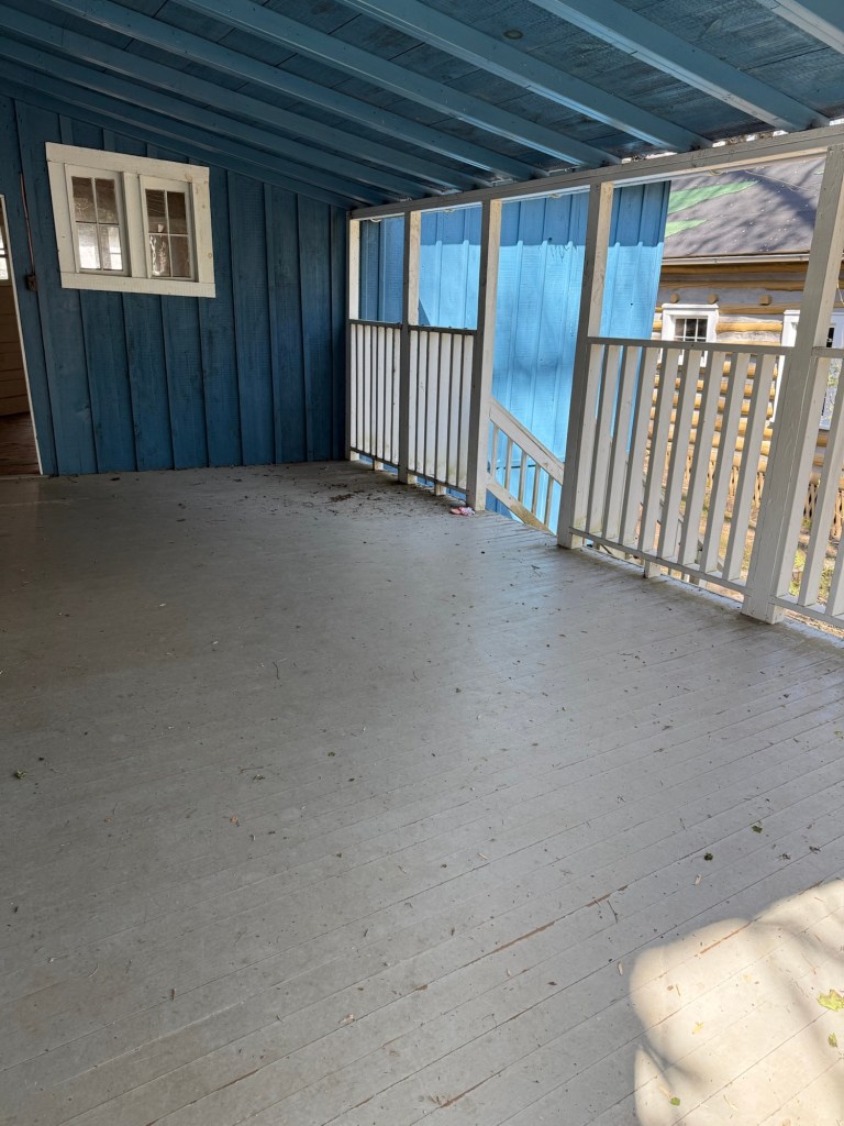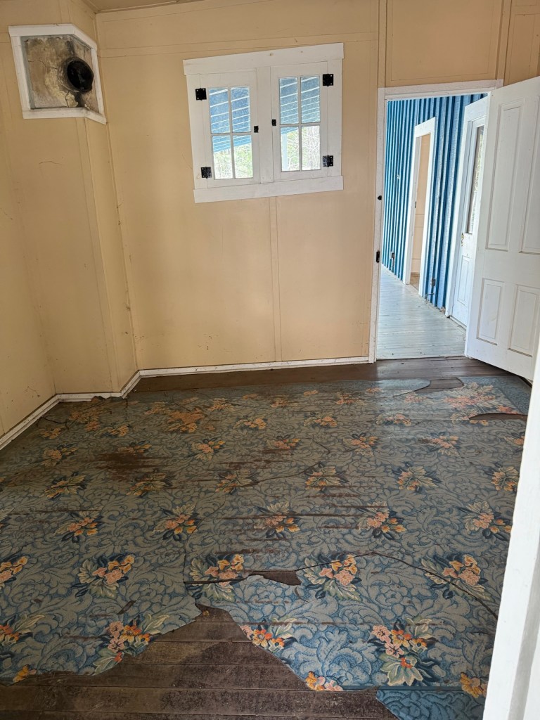 This little blue house was one of my favorites. I loved the big front porch and the large covered back deck for catching the breeze. The linoleum in the front room must have been really pretty in its heyday and look at that amazing farmhouse sink! This seems like it would have been a great place to get away from everything for a while.