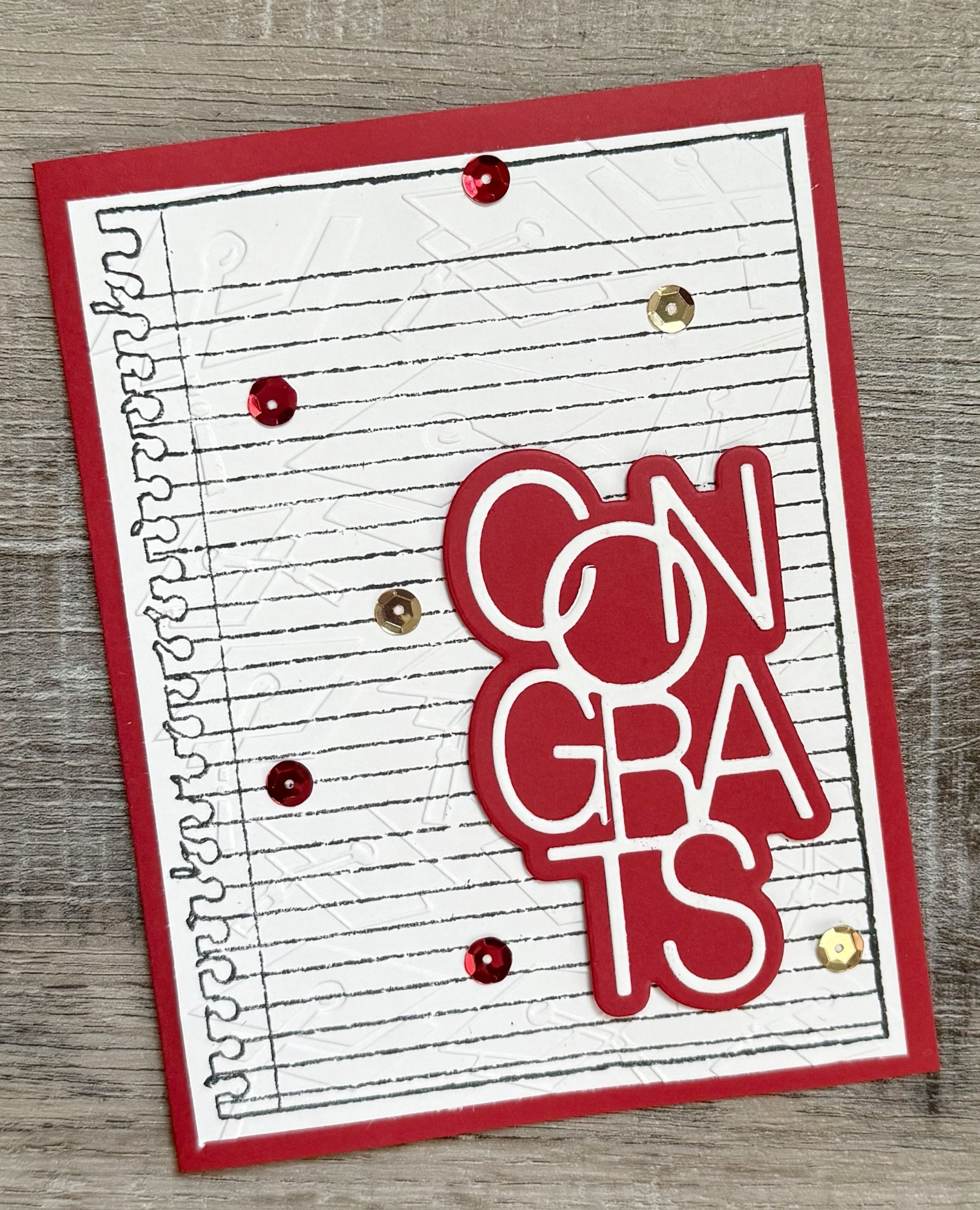 The Jot It Down Background stamp is from Unity Stamp Company. I stamped it with Memento Tuxedo Black ink on white card stock. I trimmed it down so the piece measured 5.25 by 4 inches. Then I embossed it with a graduation cap embossing folder (similar to this). I attached the piece to a red card.