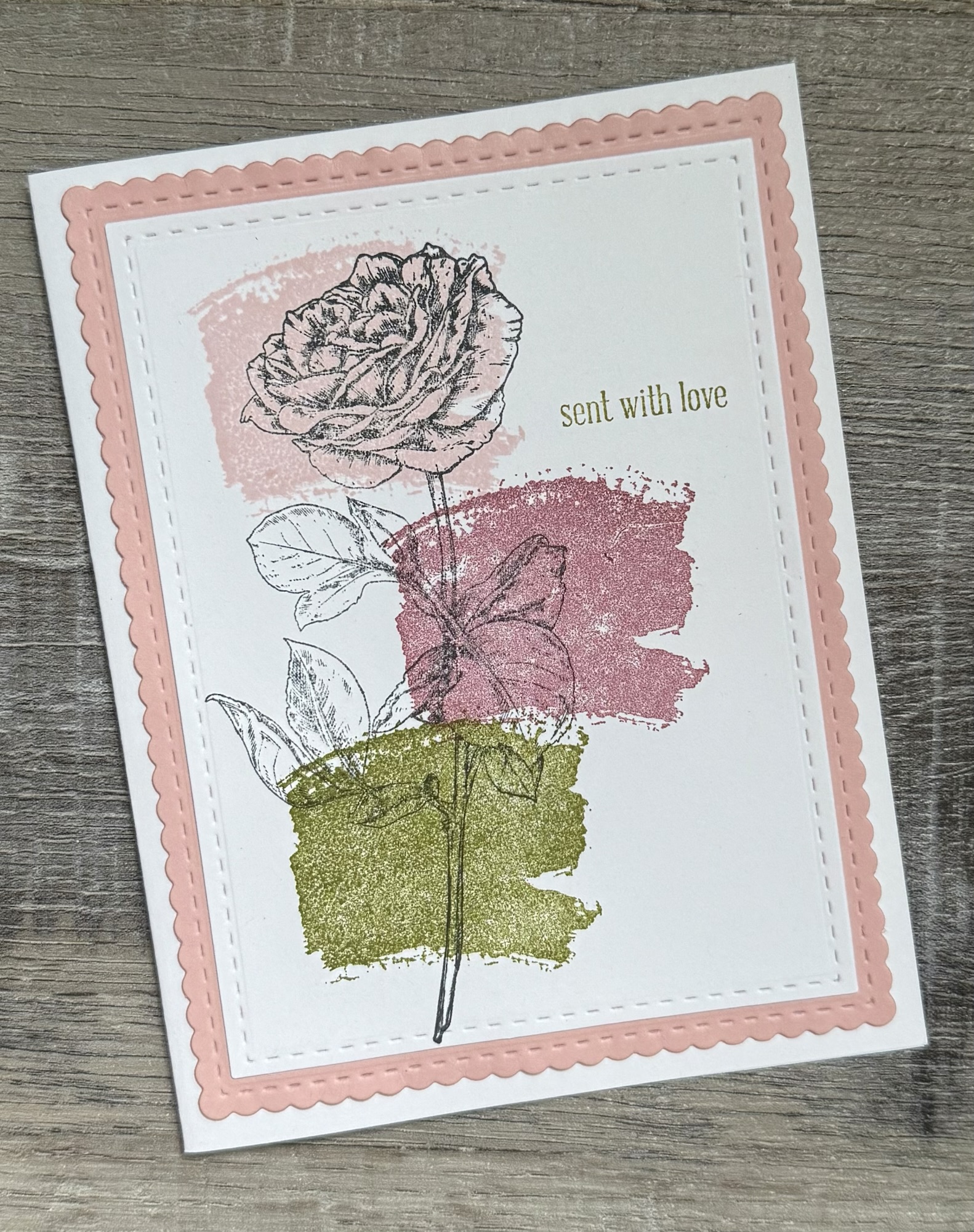 The rose is from the Lovely Reminder stamp set from Unity Stamp Company and it is still available. The abstract swoosh is from a long discontinued set from Stampin’ Up called Work of Art. I think you could create a similar look by dragging a small ink cube across your card stock. The sentiment is also from a discontinued set from Stampin’ Up, but you could use any sentiment you have in your collection.