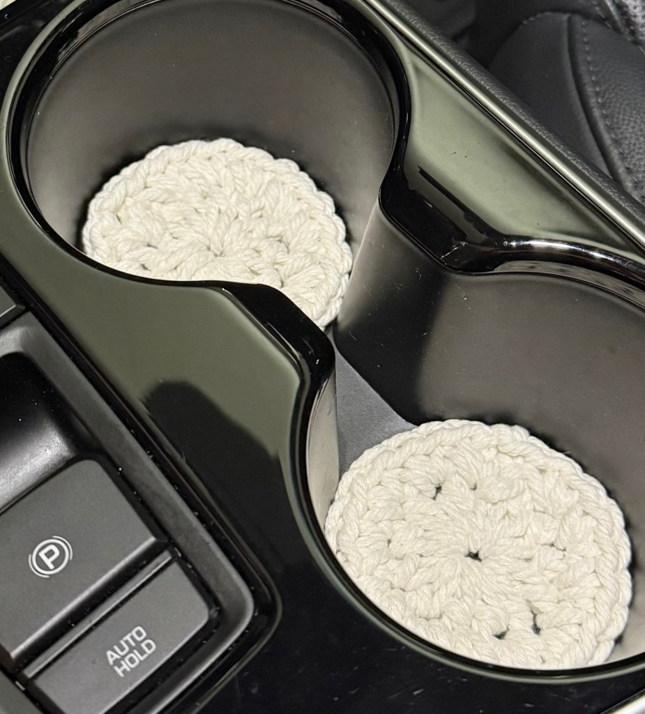 I had some stone car coasters in my car and got tired of them sticking to the bottom of my cup due to condensation. I would pick up my cup and the coaster would fall off back into the cup holder – which can be a bit disconcerting when you’re driving along. š³ The Crochet Cotton Car Coasters will absorb the condensation so that won’t happen. š And you can toss them in the washer when they get dirty – I would skip the dryer and just let them air dry.