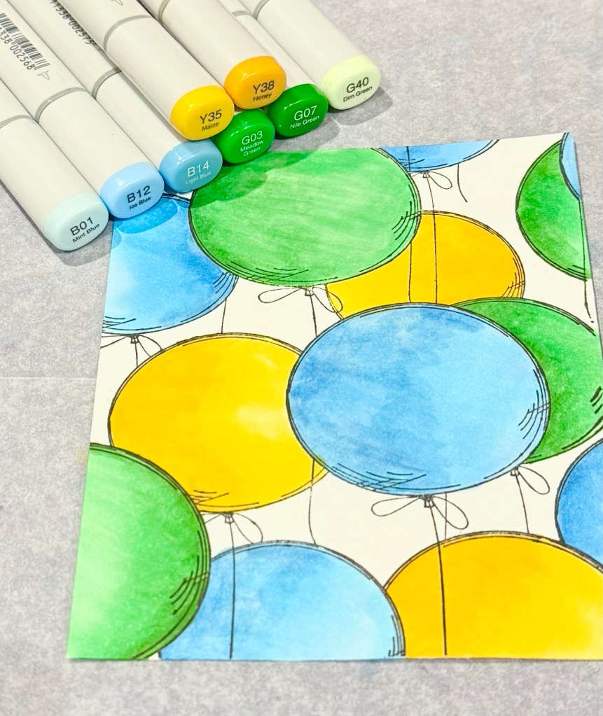 I used the Balloon Party Background stamp from Unity Stamp Company to create the base of the card. I stamped the balloons with Memento Tuxedo Black Ink on white card stock and colored it with Copic Markers. I die cut the piece using the Scallops & Rectangles Nesting Dies and attached it to blue card stock. The piece is then attached to a white card.