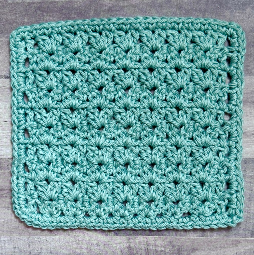 I stitched up my Crochet Cluster V-Stitch Spa Cloth using I Love This Cotton Yarn in Ivory and Serene Spa and an H/5mm crochet hook. You can find the easy pattern below along with links to free PDFs – one with photos and one without – for easy printing.