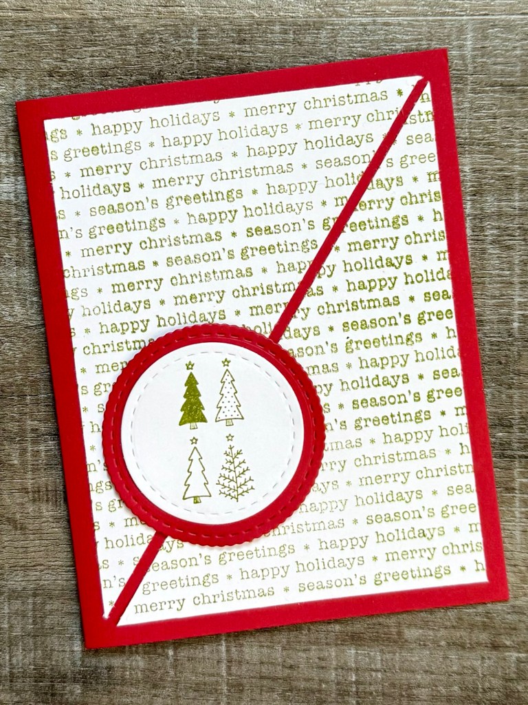 My background stamp is a discontinued stamp from My Favorite Things called Christmas Greetings Background. You can use any fun Christmas background stamp or even patterned paper. The Christmas tree stamp is from the 2024 Advent calendar from Unity Stamp Company. Any small Christmas themed stamp would be great in this layout.