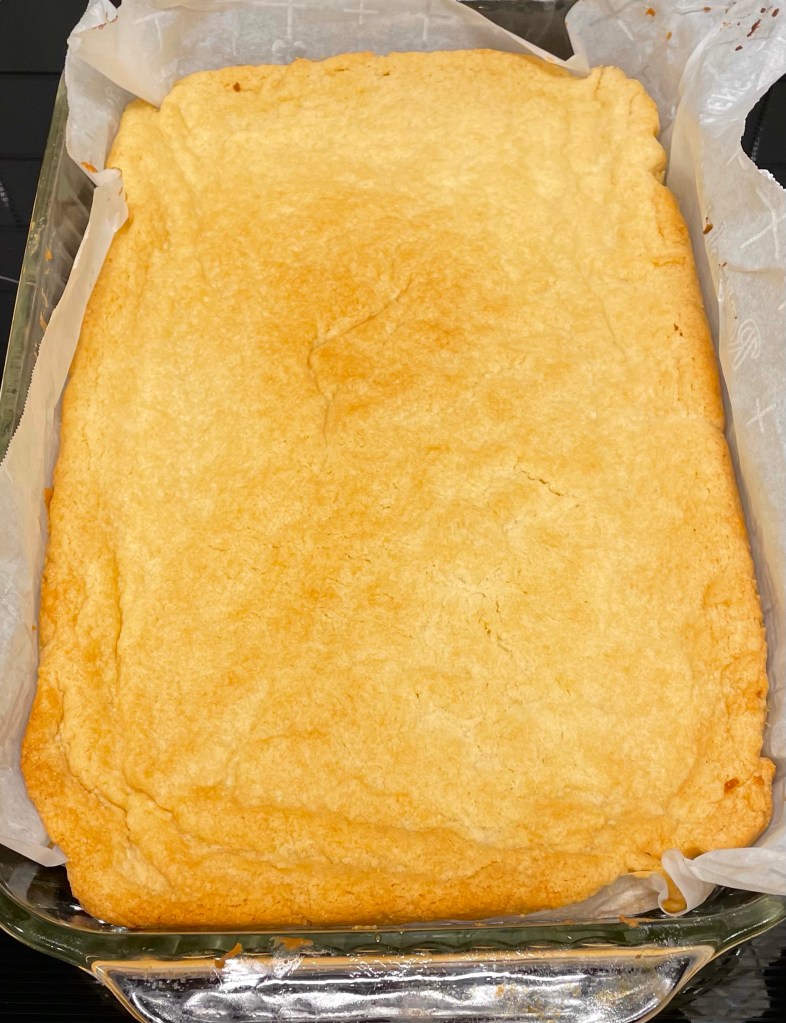 Here’s the dough ready to go into the oven… It’s a thick sticky dough so I lightly sprayed my clean hands with cooking spray to spread it out and pat it in the pan that I lined with parchment paper.