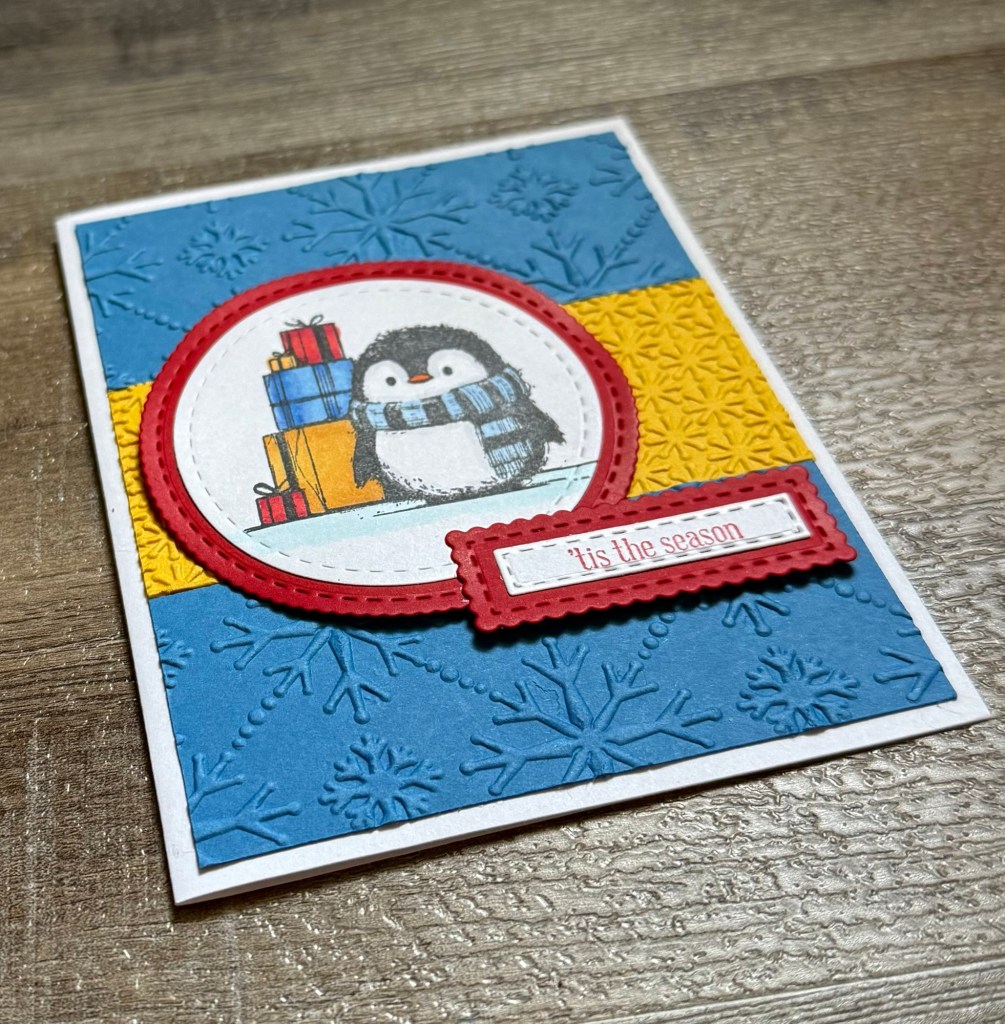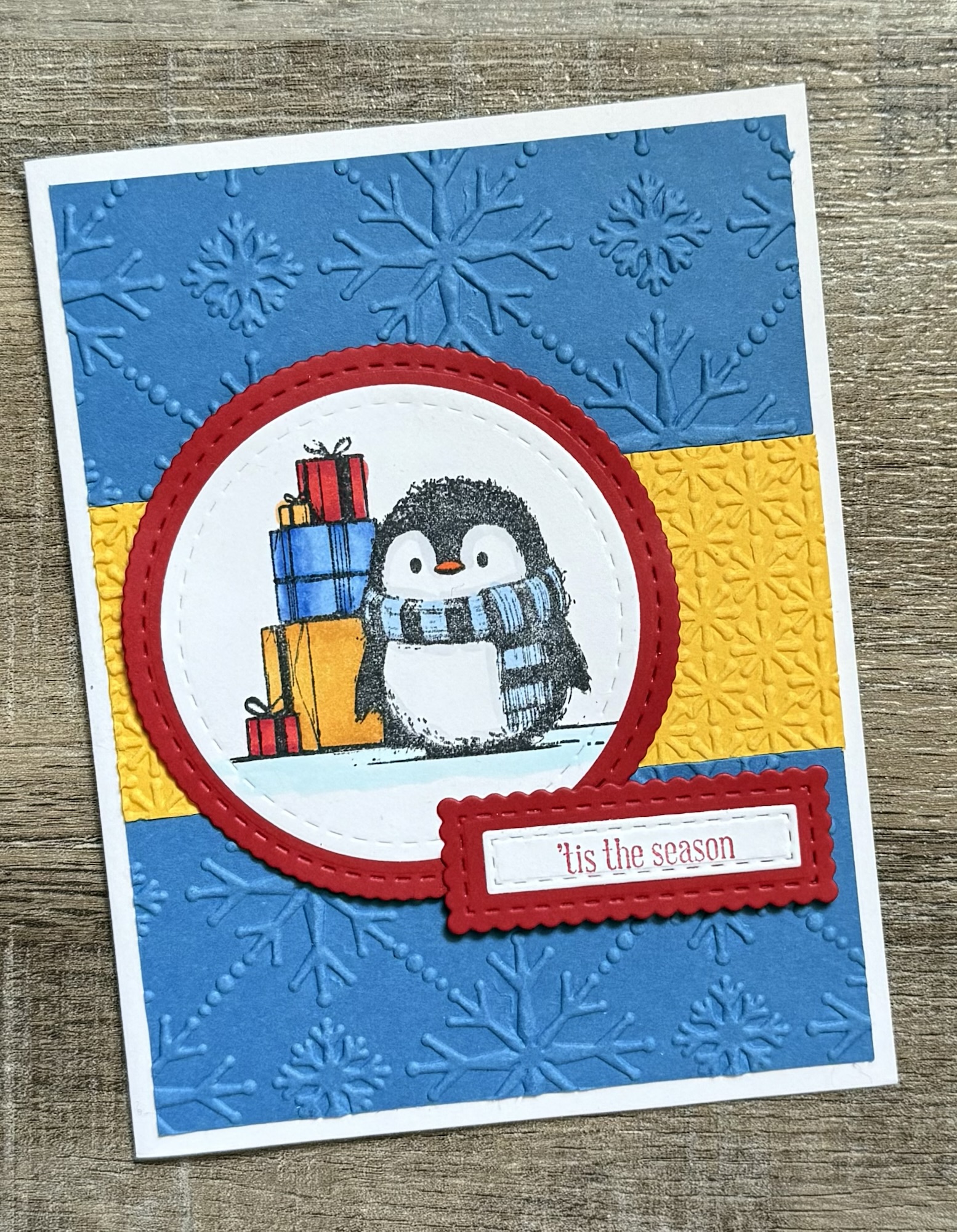 I stamped the sentiment with red ink on white card stock, die cut around it with these Scalloped & Stitched Sentiment Dies, and layered it to red card stock cut with the same die set. Both the penguin and the sentiment are attached to the card with foam tape.