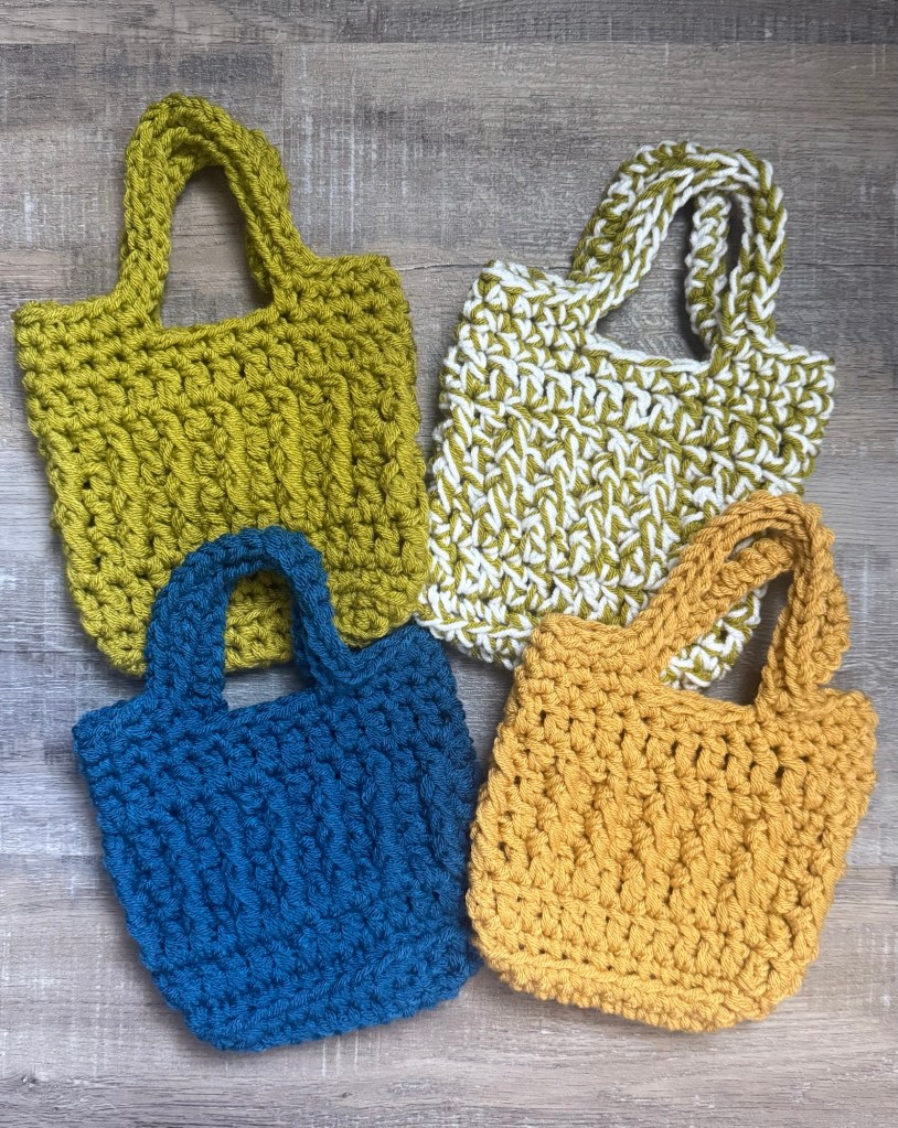 My Small Crochet Ridged Gift Bag works up quickly holding 2 stands of yarn together and an M/N 9mm crochet hook. I used Yarn Bee Soft & Sleek yarn to stitch up my bags, but any worsted weight yarn can be used.
