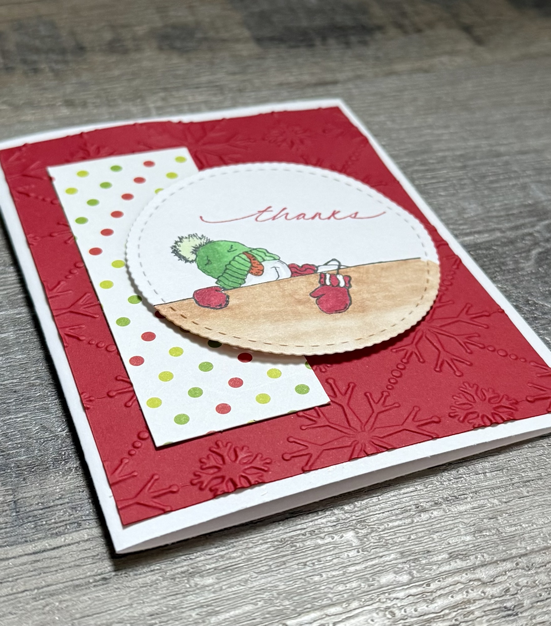 Using these Scallops and Circles Nesting Dies, I die cut around the image. Then I stamped βthanksβ with red ink at a slight angle. My “thanks” stamp is an old one from my collection, but this one would be cute.