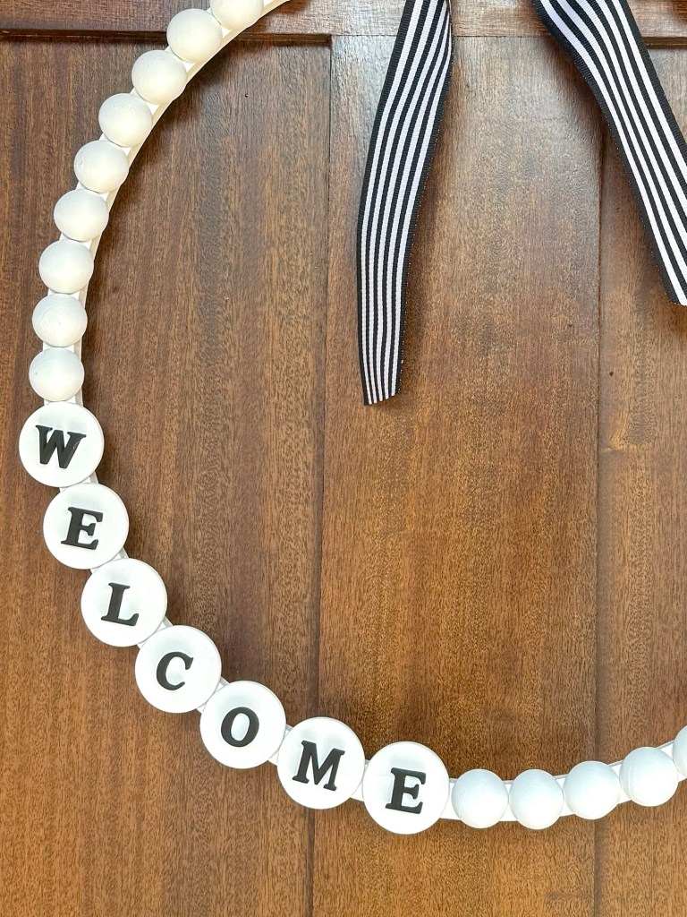 Using E6000 clear adhesive, I attached the letters to the circles and glued them to the wreath. Then I glued the split beads around the rest of the wreath. I tied a ribbon around the top for hanging and added a bow with a split bead attached to the center.
