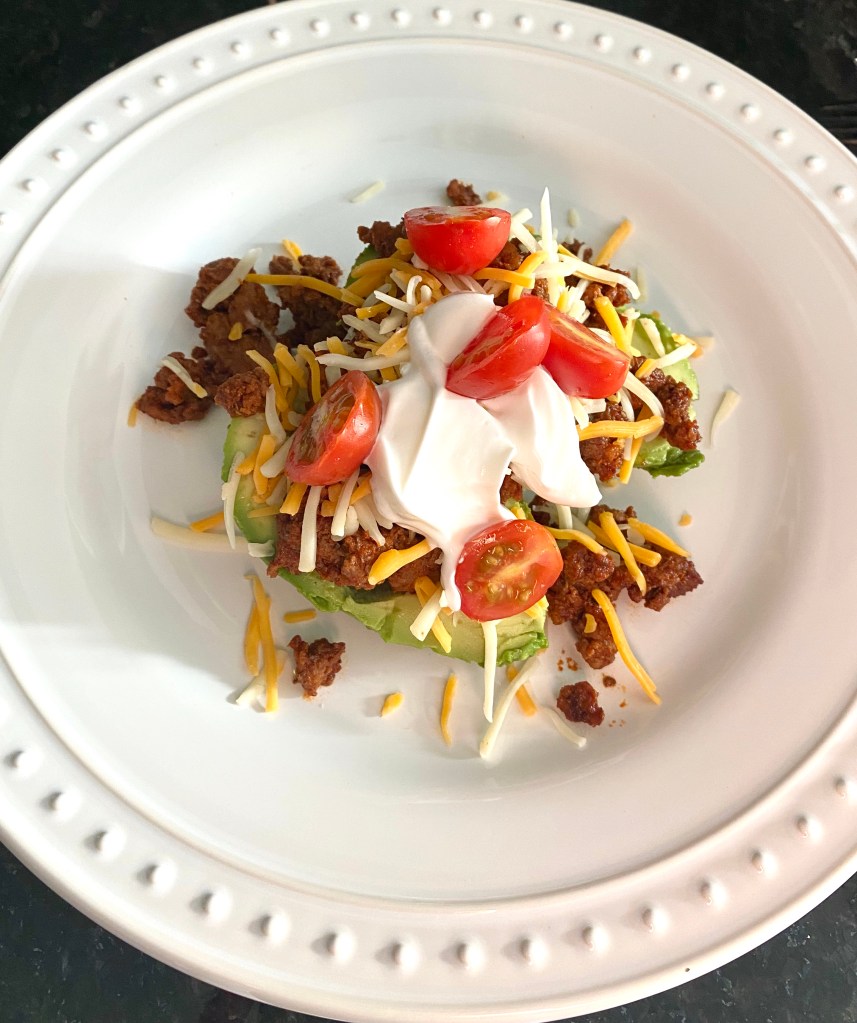 After cutting my avocados in half and removing the pit, I carefully scooped out each half keeping it intact. I placed the halves on my plate and added the cooked taco meat. Then just add your favorite toppings – cheese, sour cream, tomatoes, lettuce, cilantro – all the yummy toppings you would add to a traditional taco.