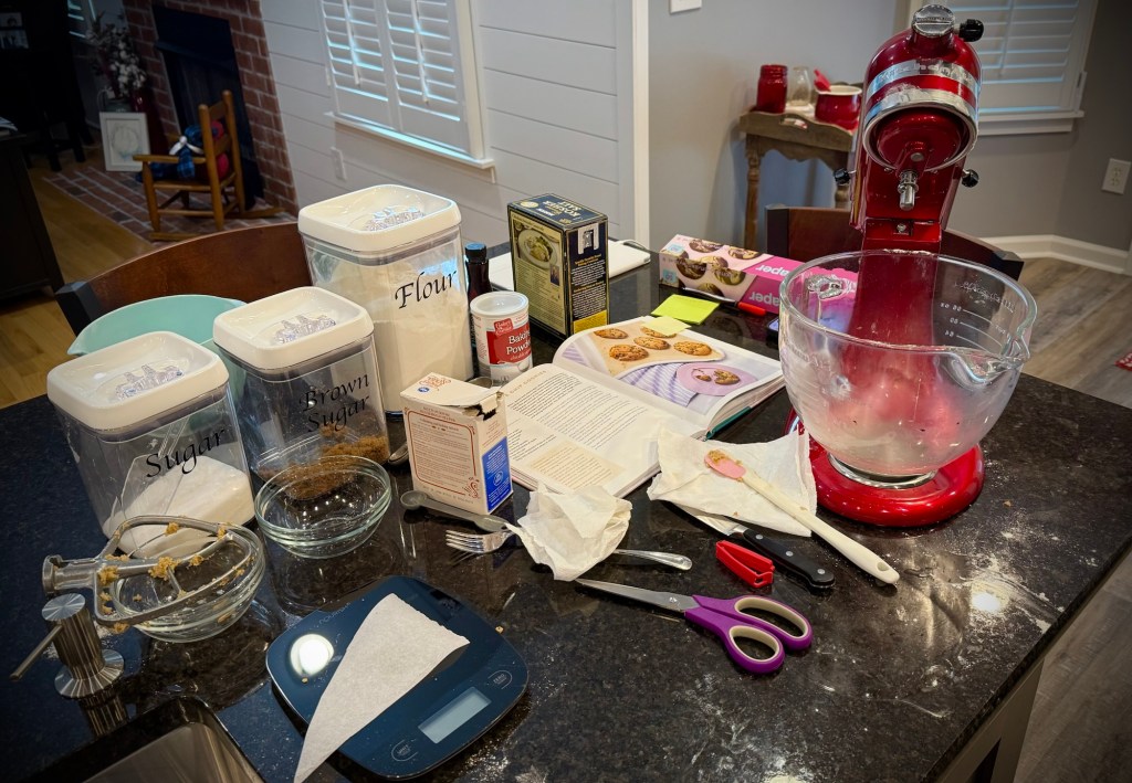 This is the counter after he mixed up the dough. He’s just as messy in the kitchen as I am. 🙃
