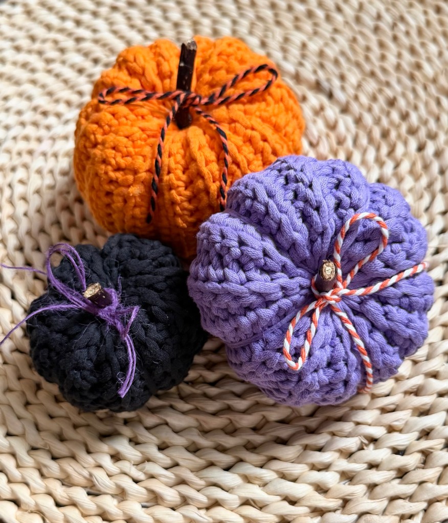 I used Beginner Bee Yarn from Hobby Lobby in Orange, Purple, and Black with a G/4mm crochet hook to stitch up my Halloween pumpkins.
