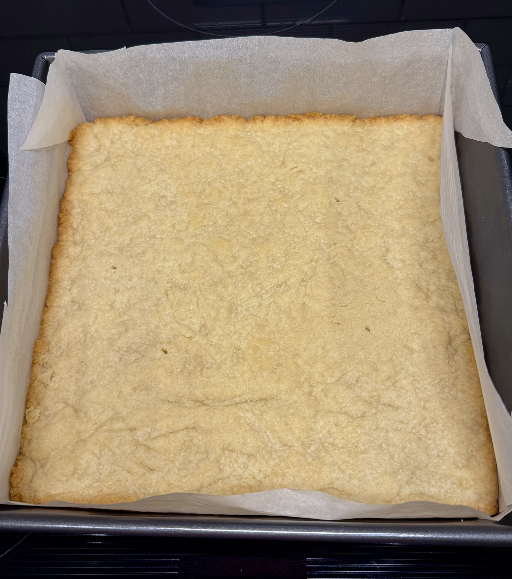The shortbread layer mixed together and fresh from the oven…