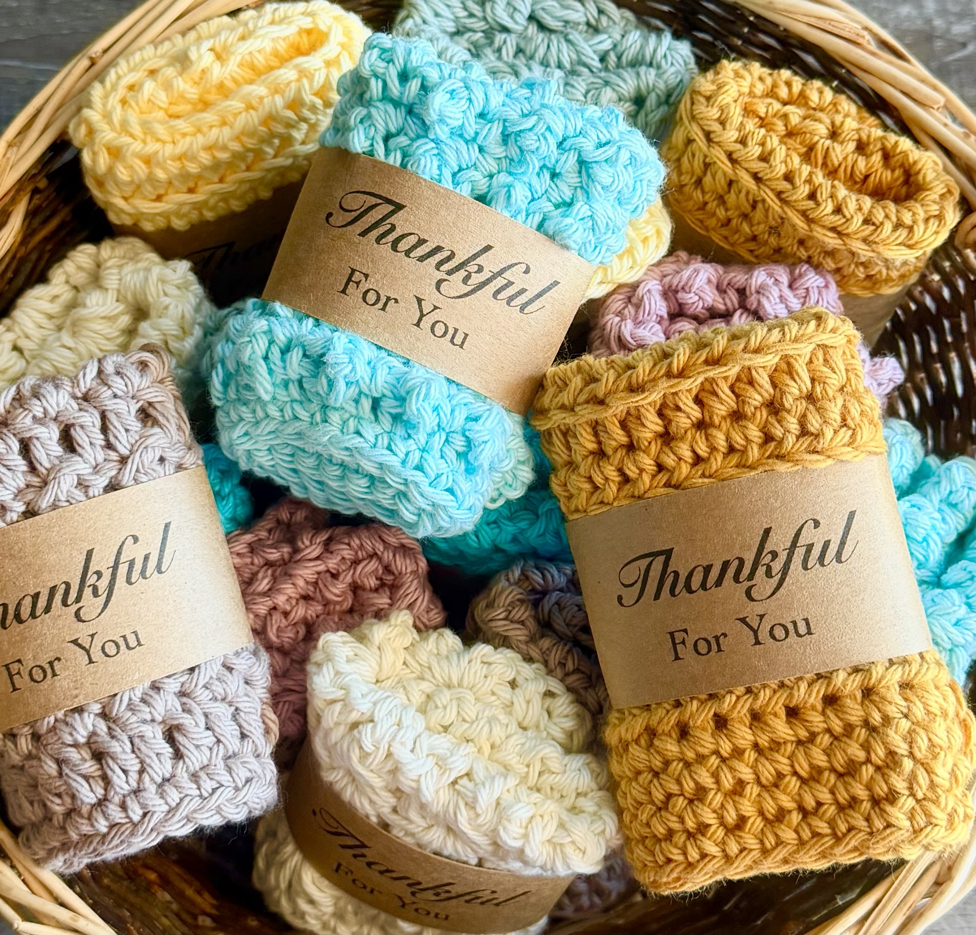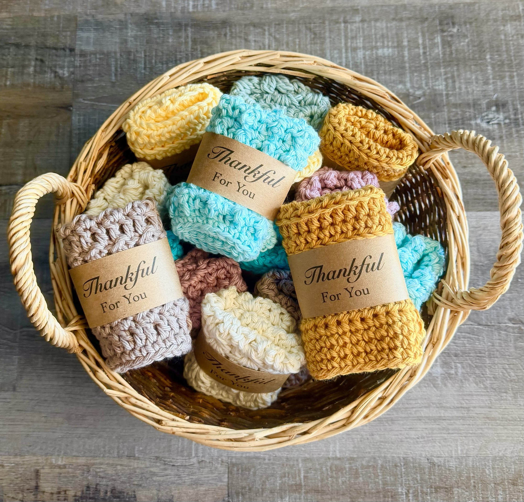 Hereβs one way you can use my Thankful For You wrap labels. I printed the wrap labels on kraft card stock and cut them into strips. I folded up some crocheted dishcloths, wrapped the labels around them, and secured them with clear tape. These make fun little thinking of you gifts. (If you need some crochet dishcloth patterns, just enter βdishclothβ or βspa clothβ in the search bar above on the right- I have several free patterns on my blog. π)