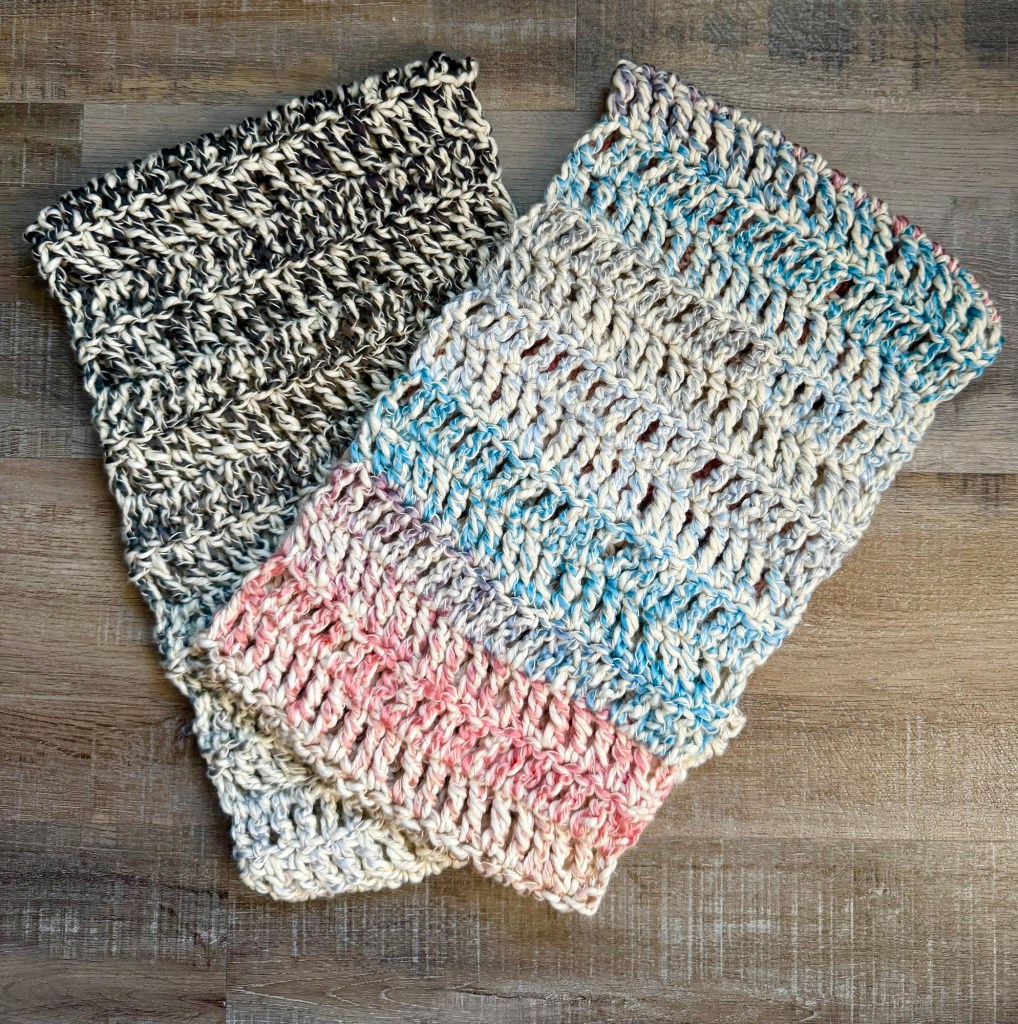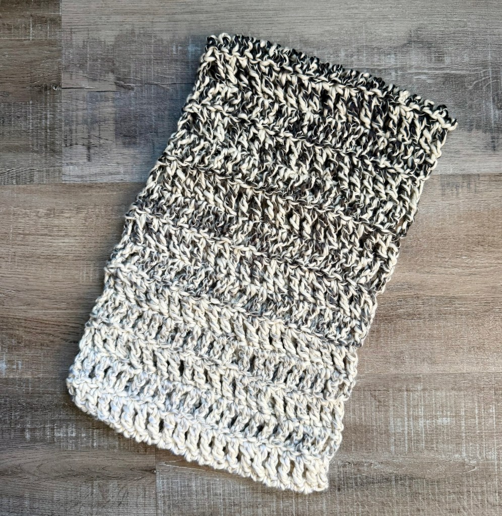 The Crochet Treble Stitch Cowl is soft and drapes beautifully using a soft bulky weight (5) yarn along with a K/6.5mm crochet hook. I used Yarn Bee Arabella in Whimsical Whirlwind and Charcoal Checkmate. This yarn is discontinued but any soft bulky (5) weight yarn will work.