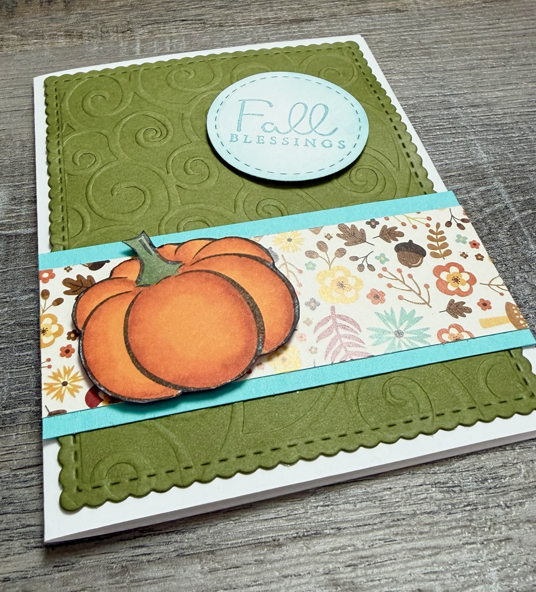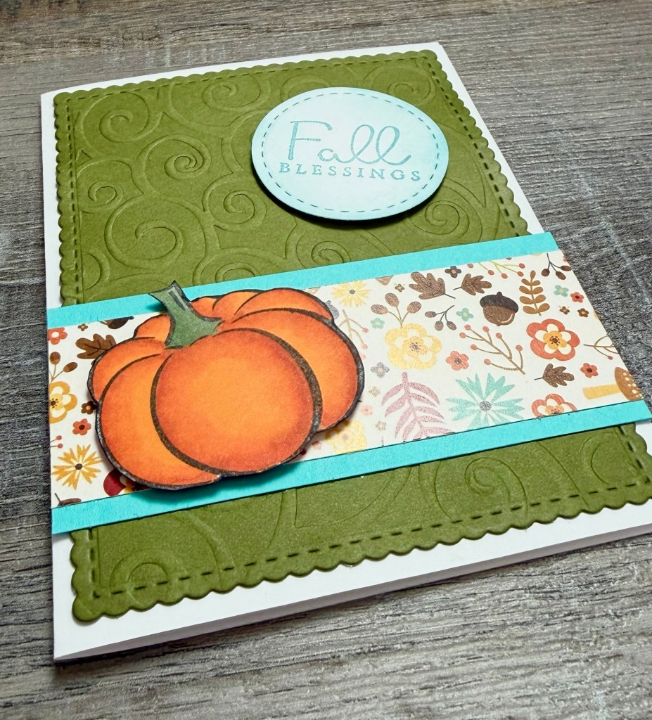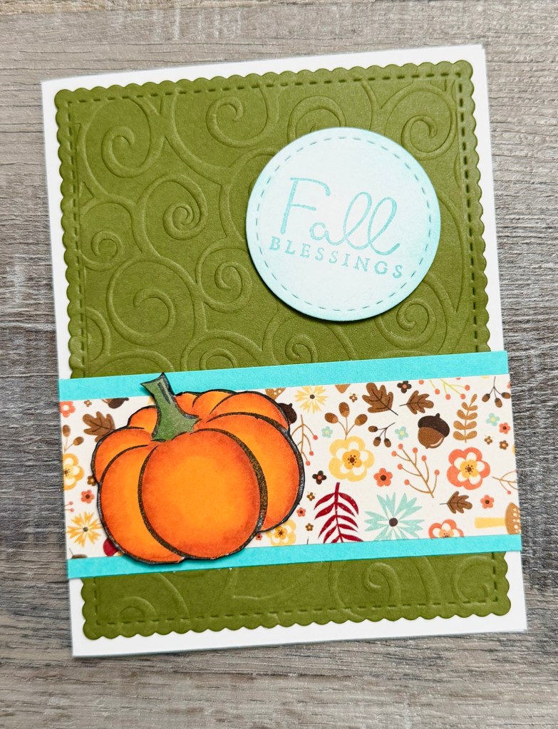 To make the card, I embossed a piece of green card stock with a swirl embossing folder (this is similar), die cut the piece with these Scallops & Rectangles Nesting dies, and attached it to a white card. I layered a piece of patterned paper to turquoise card stock and attached the piece to the card. Both the pumpkin and the sentiment are attached to the card with foam tape.