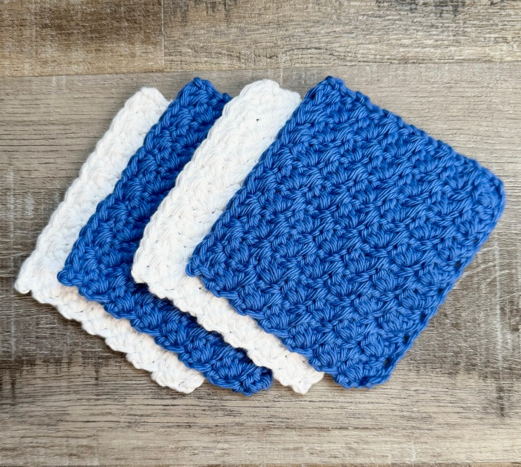 For my coasters, I used I Love This Cotton yarn in Royal and White with a G/4mm crochet hook. The pattern is below along with links to free PDFs – one with photos and one without – if you’d like to easily print it.