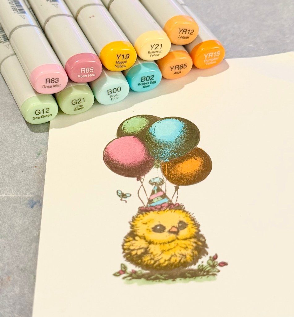 I stamped the chick with Memento Rich Cocoa ink on white card stock (the lighting isn’t great in the photo below, but I promise the card stock is white 🙂 ), and colored her with Copic markers.