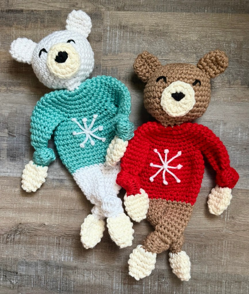 The bears are stitched up with chunky yarn so they work up quickly. I did the snowflakes slightly different from the pattern. I added French knots on the ends of them. Other than that I followed the pattern as written.