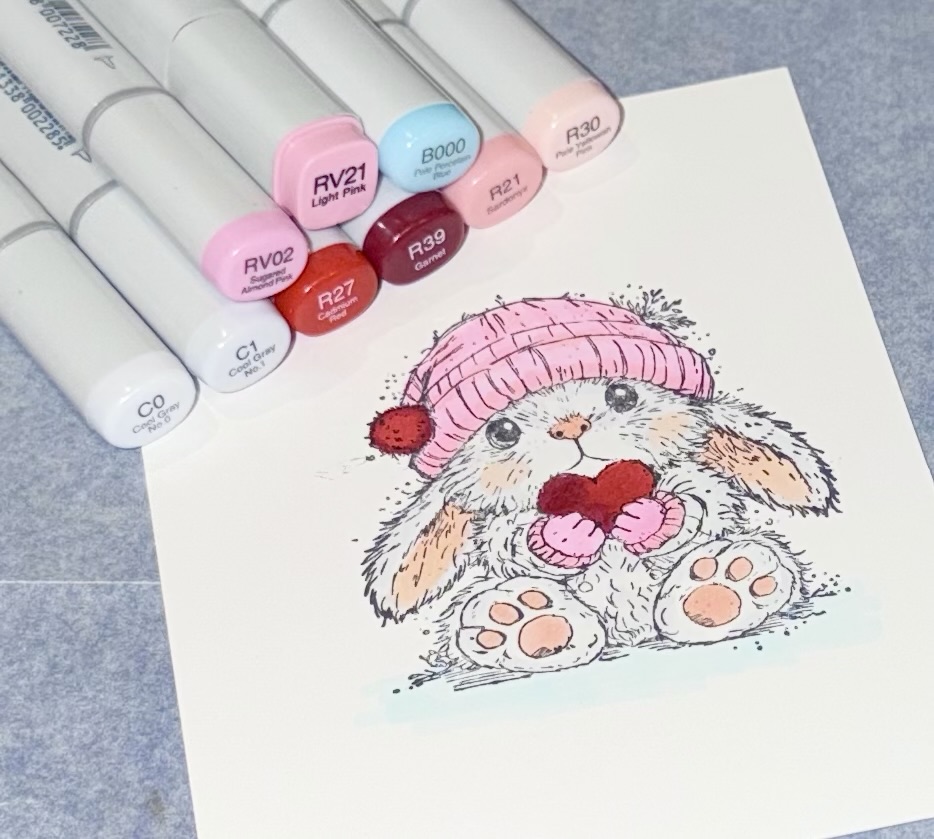 I stamped the image with Memento Tuxedo Black Ink on white card stock. I used my Misti Stamping Tool so I could stamp it twice to get a good image. Then I colored the bunny with Copic markers.