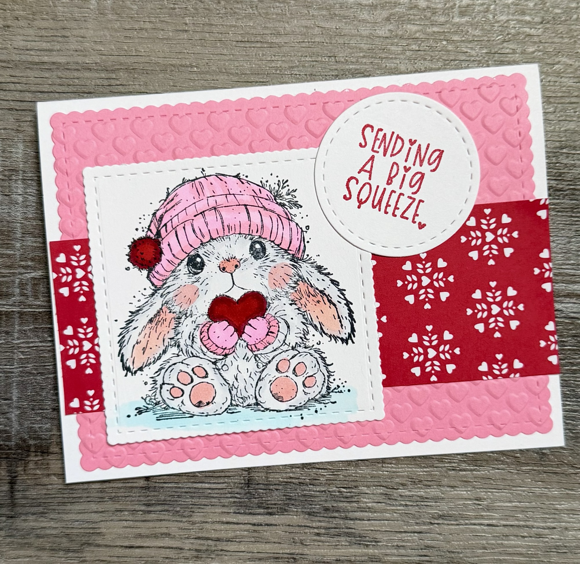 To make the card, I die cut a piece of pink card stock with these Scallops & Rectangles Nesting Dies, embossed it with a heart embossing folder (similar to this), and attached it to a white card. I attached a strip of red patterned paper to the card and then added the bunny and sentiment.