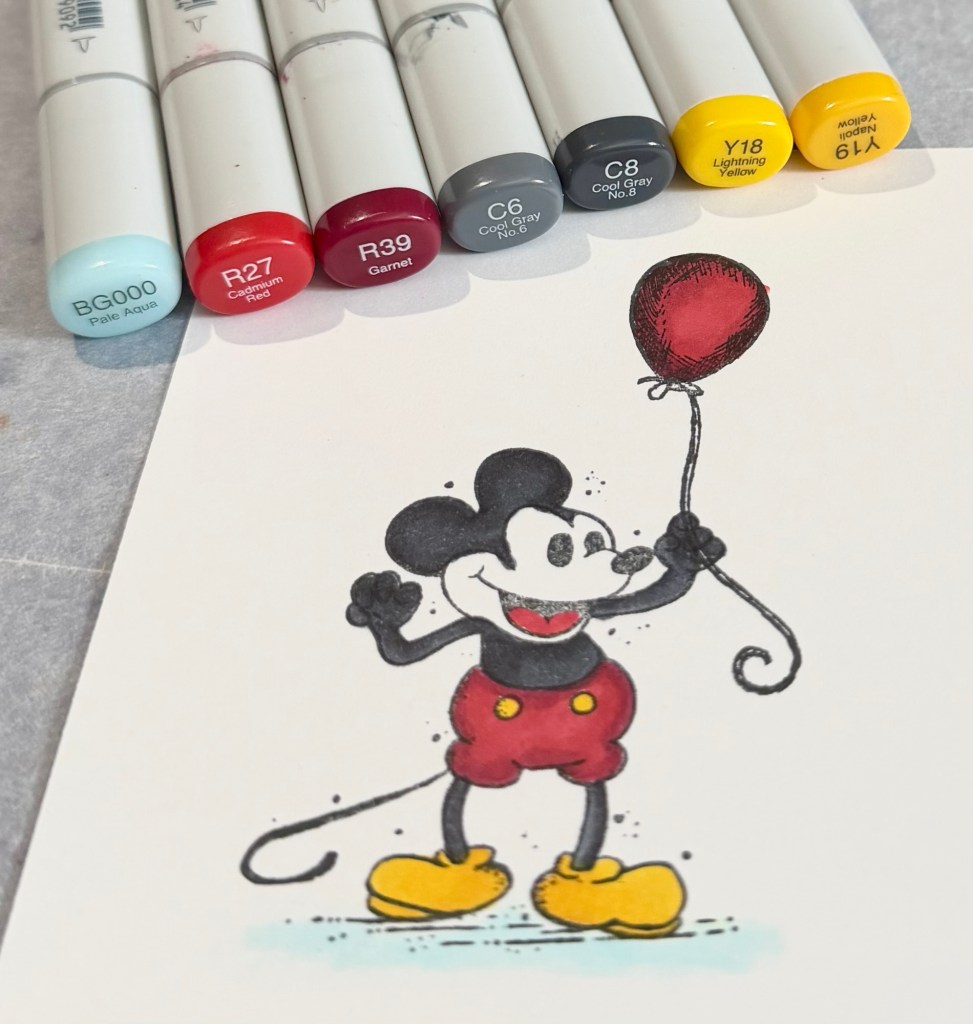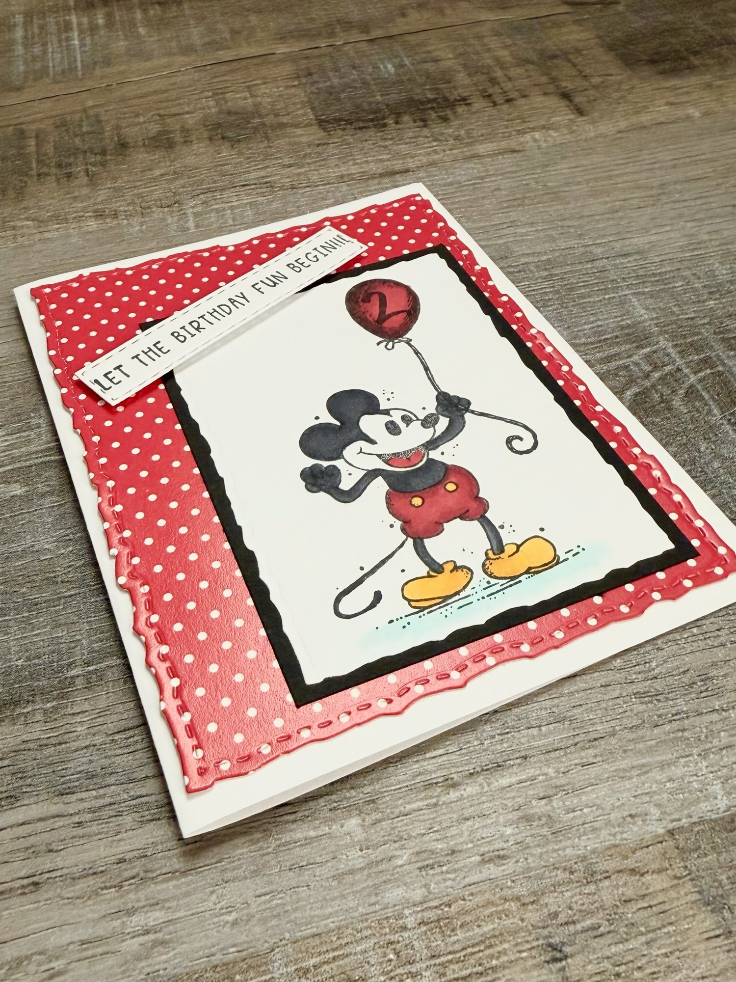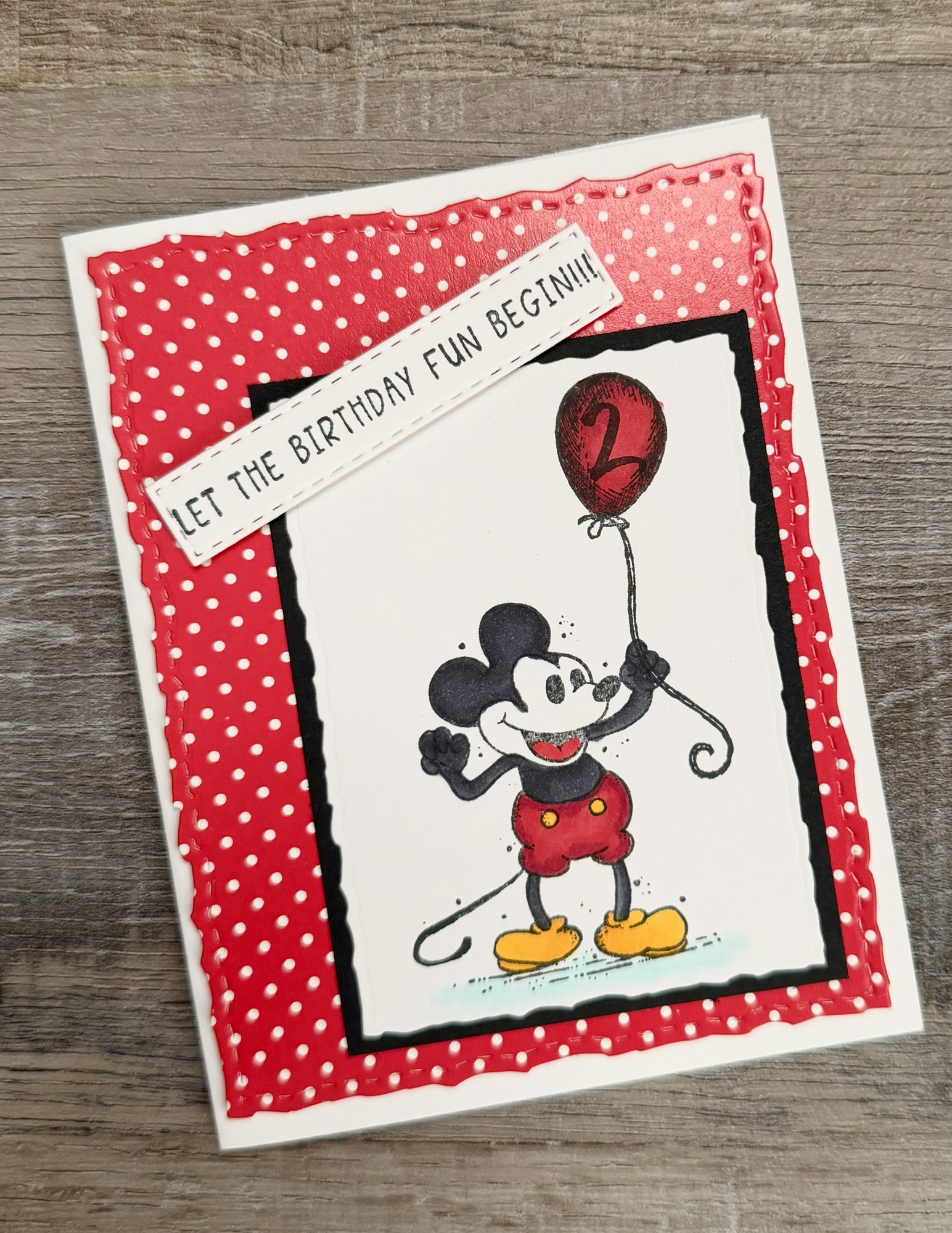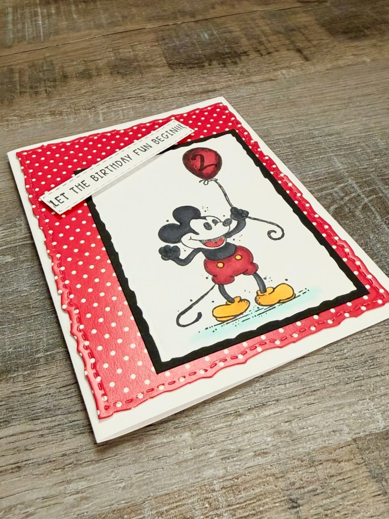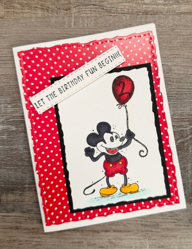 I stamped Mickey using Memento Tuxedo Black Ink on white card stock and colored him with Copic markers. I die cut around the image using these Deckle & Stitches Nesting Dies. Then I layered it to black card stock die cut with the same set. This card was for a cute little boy turning 2 so I stamped a “2” with black ink inside the balloon.