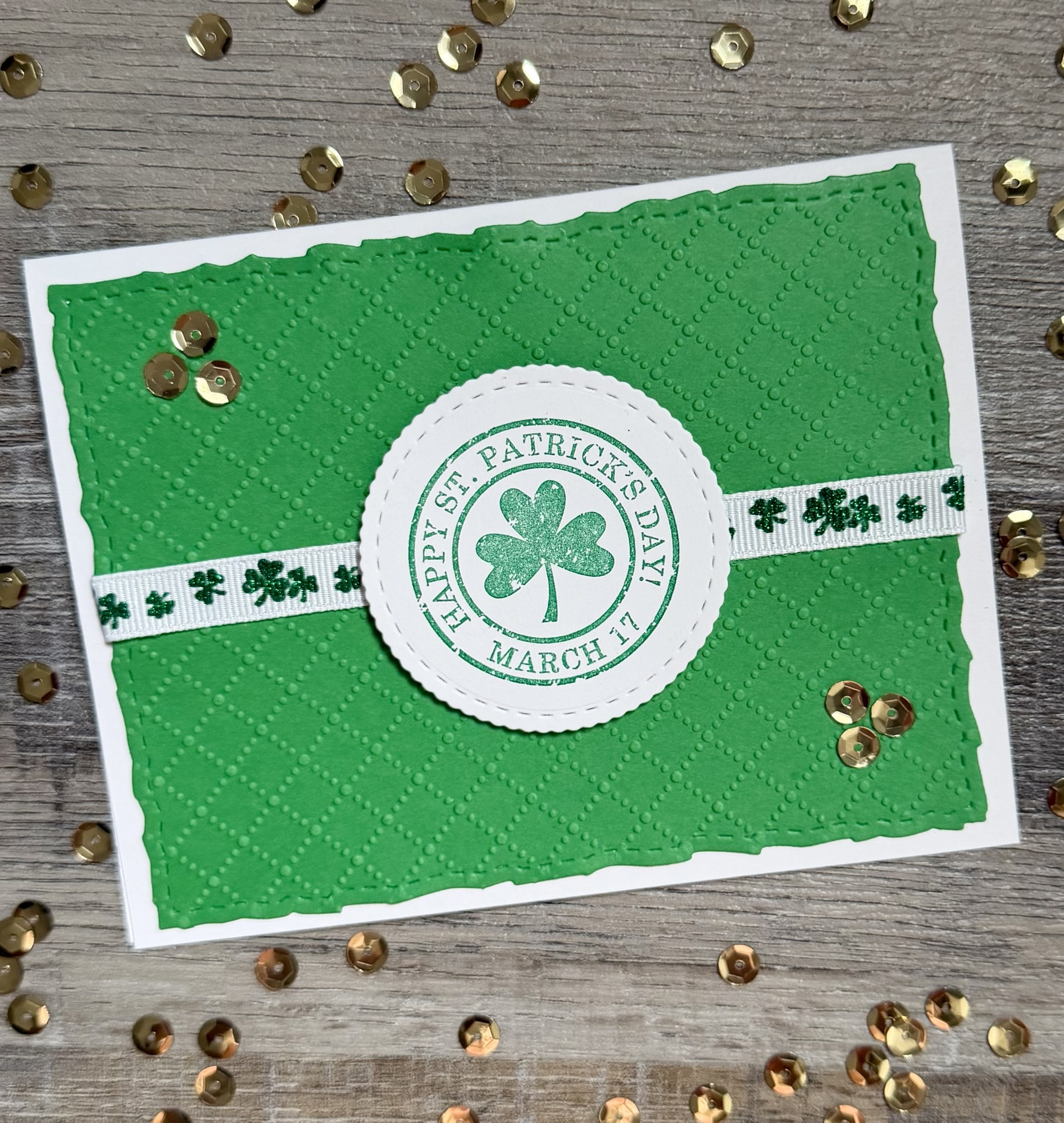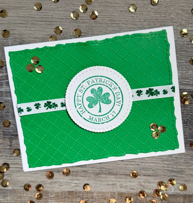 I stamped the image with green ink on white card stock and die cut around it using these Scallops & Circles Nesting Dies. I embossed a piece of green card stock with a diamond pattern embossing folder (this is similar) and die cut it with these Deckle & Stitches Nesting Dies. I added a shamrock ribbon and attached the piece to a white card. The stamped piece is attached to the card using foam tape. I finished the card by adding some gold sequins.