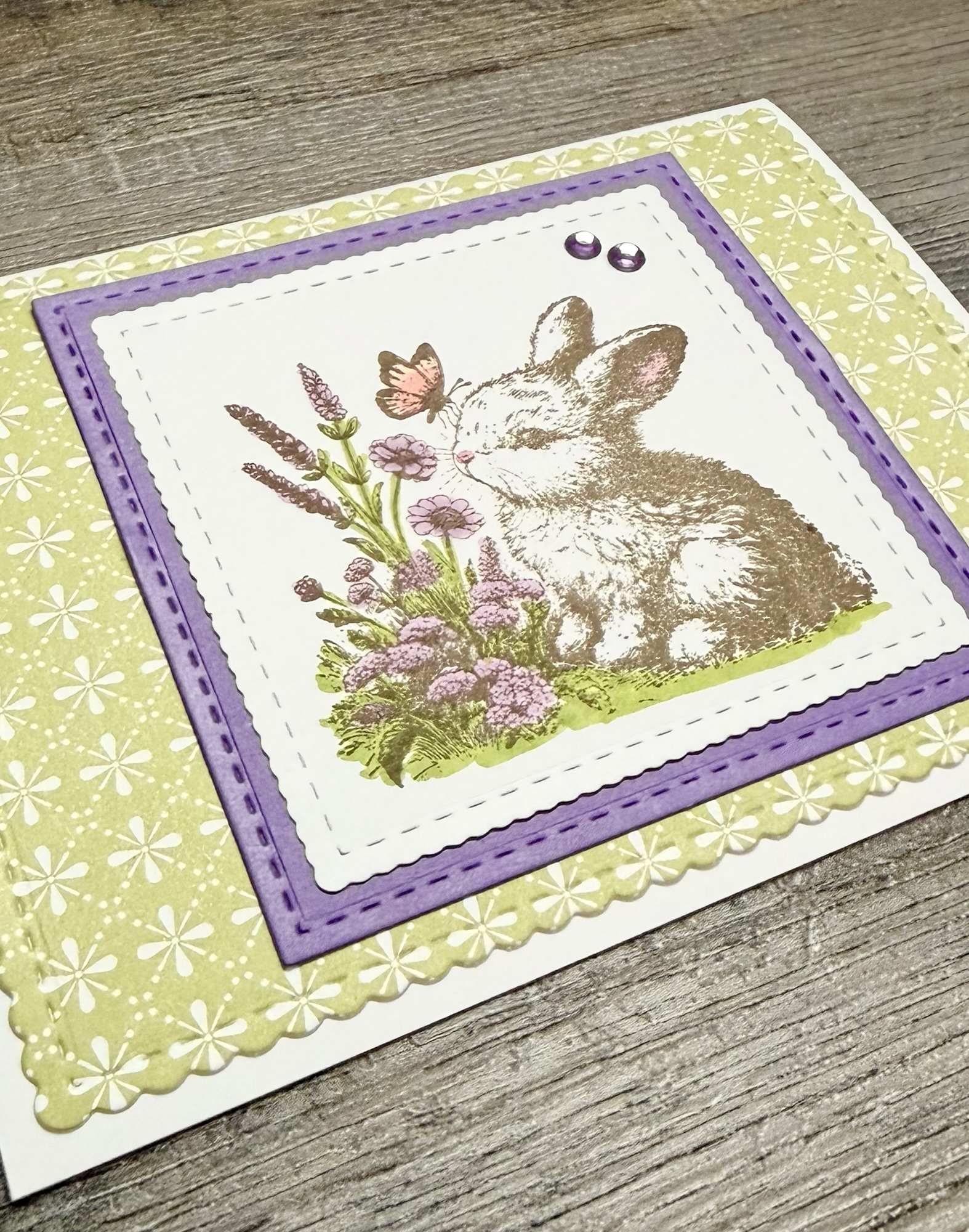 The sweet bunny is from the Whiskers and Wings stamp set from Unity Stamp Company. I stamped him with Memento Rich Cocoa Ink on white card stock and added a bit of color using Copic markers. I die cut around the image using these Scallops & Squares Nesting Dies and layered it to purple card stock die cut with the same set.