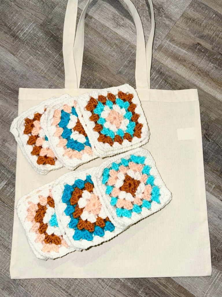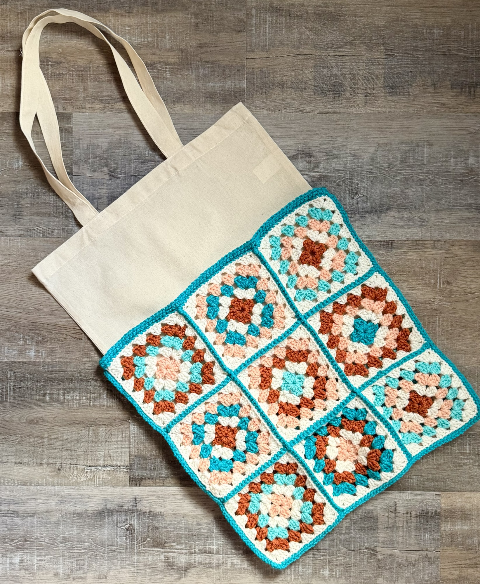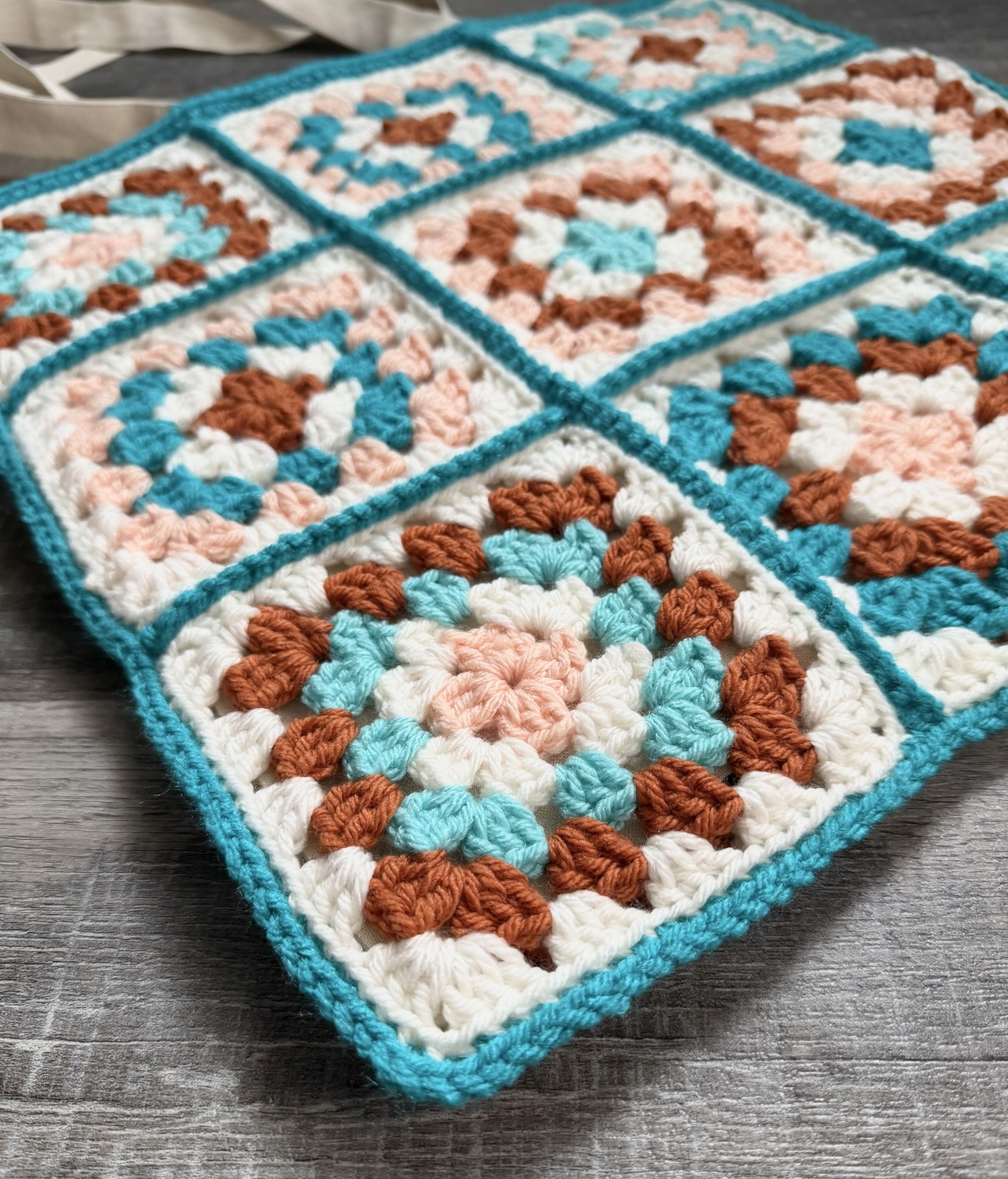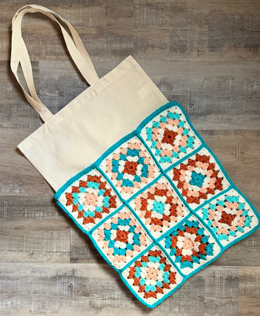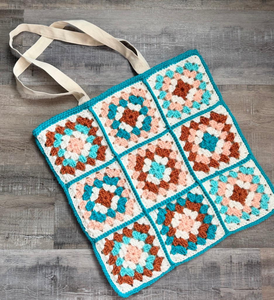 Any of your favorite worsted weight yarn (4 weight) will work great to make your tote bag. I used I Love This Yarn in Turquoise, Light Peach, Burnt Pumpkin, Ivory, and Peacock with a G/4mm crochet hook to stitch up my granny squares. If you need a refresher on how to crochet a basic granny square, this tutorial at Crochet 365 Knit Too is great.