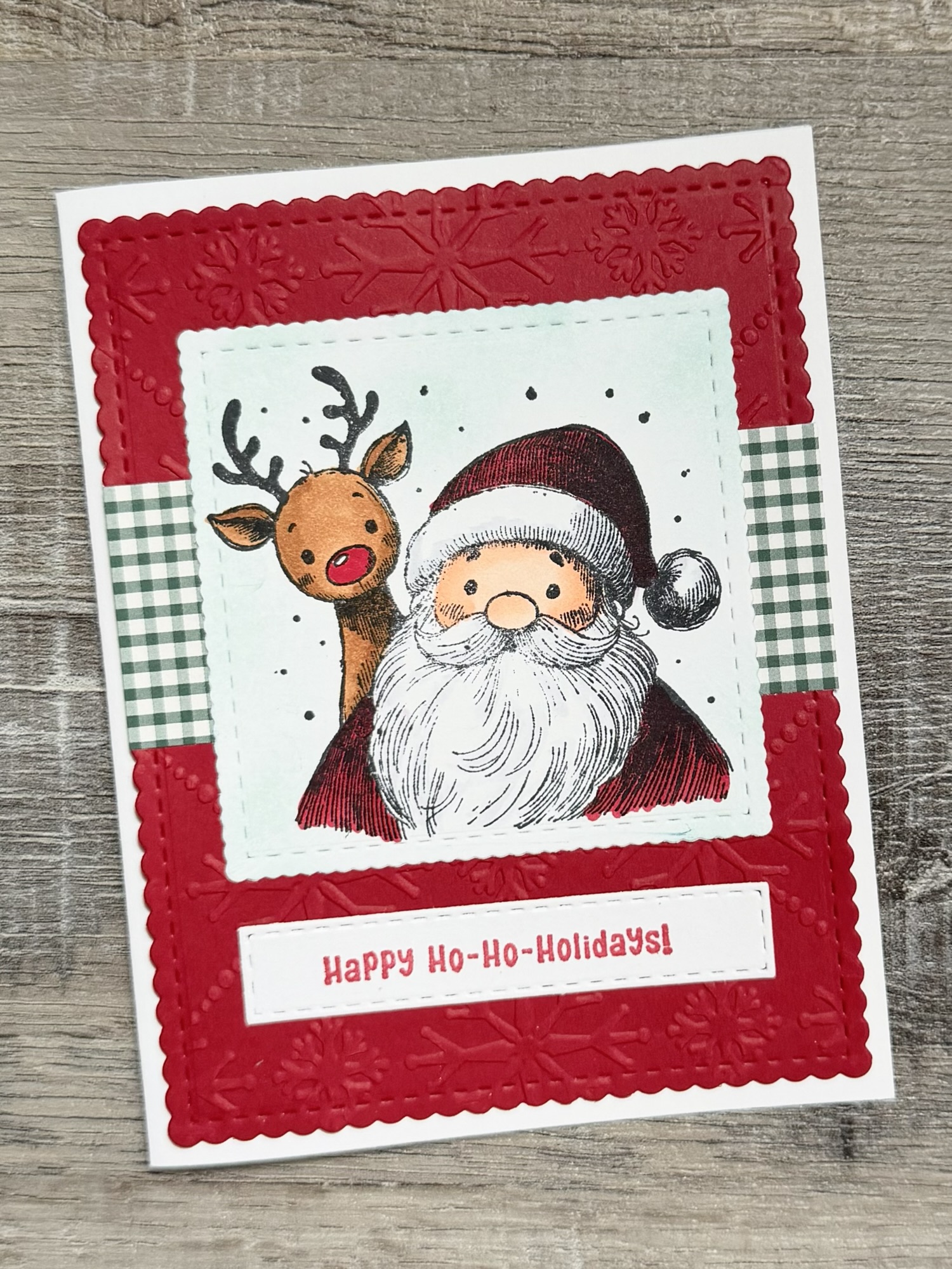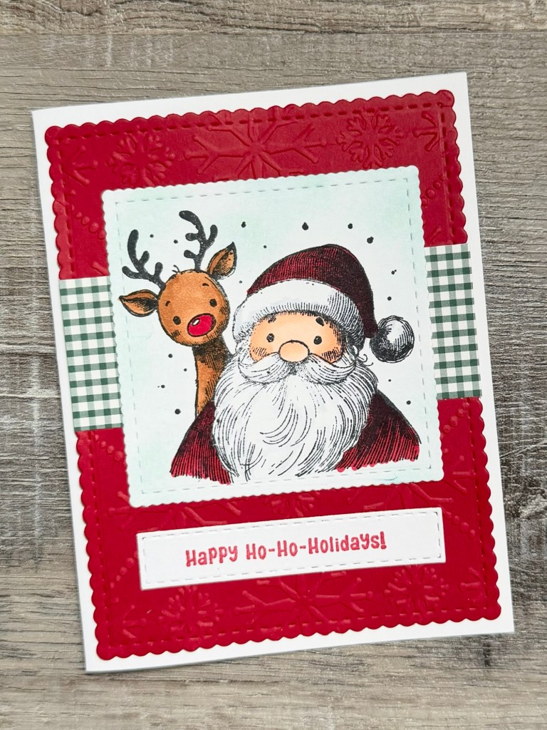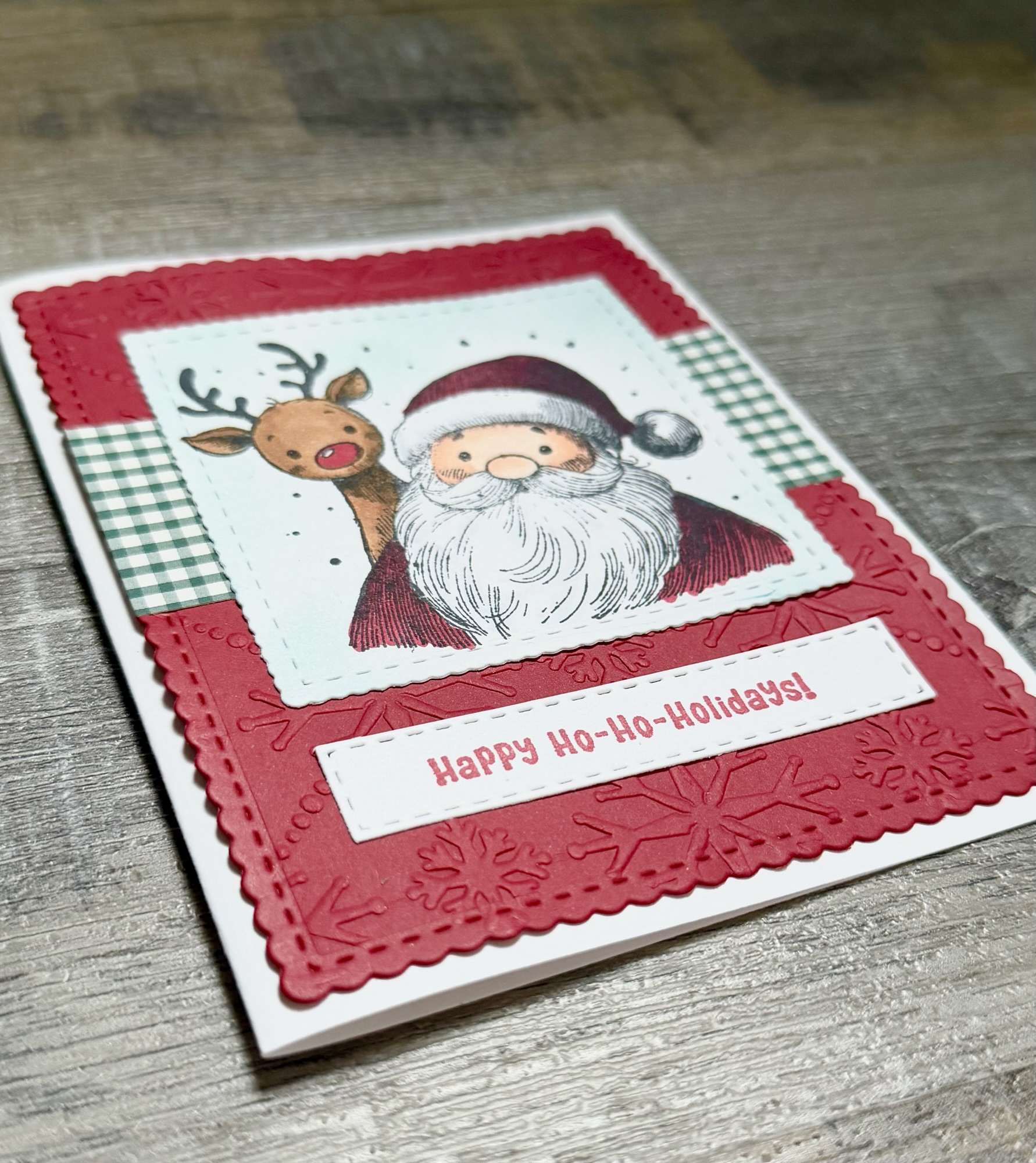 To make the card, I embossed a piece of red card stock with a snowflake embossing folder (similar to this) and then die cut it with these Scallops & Rectangles Nesting Dies. I attached the piece to a white card and added a strip of green gingham patterned paper. The Santa image is attached over the top. The sentiment is stamped with red ink on white card stock, die cut with these Scalloped & Stitched Sentiment Nesting Dies, and attached it to the card.