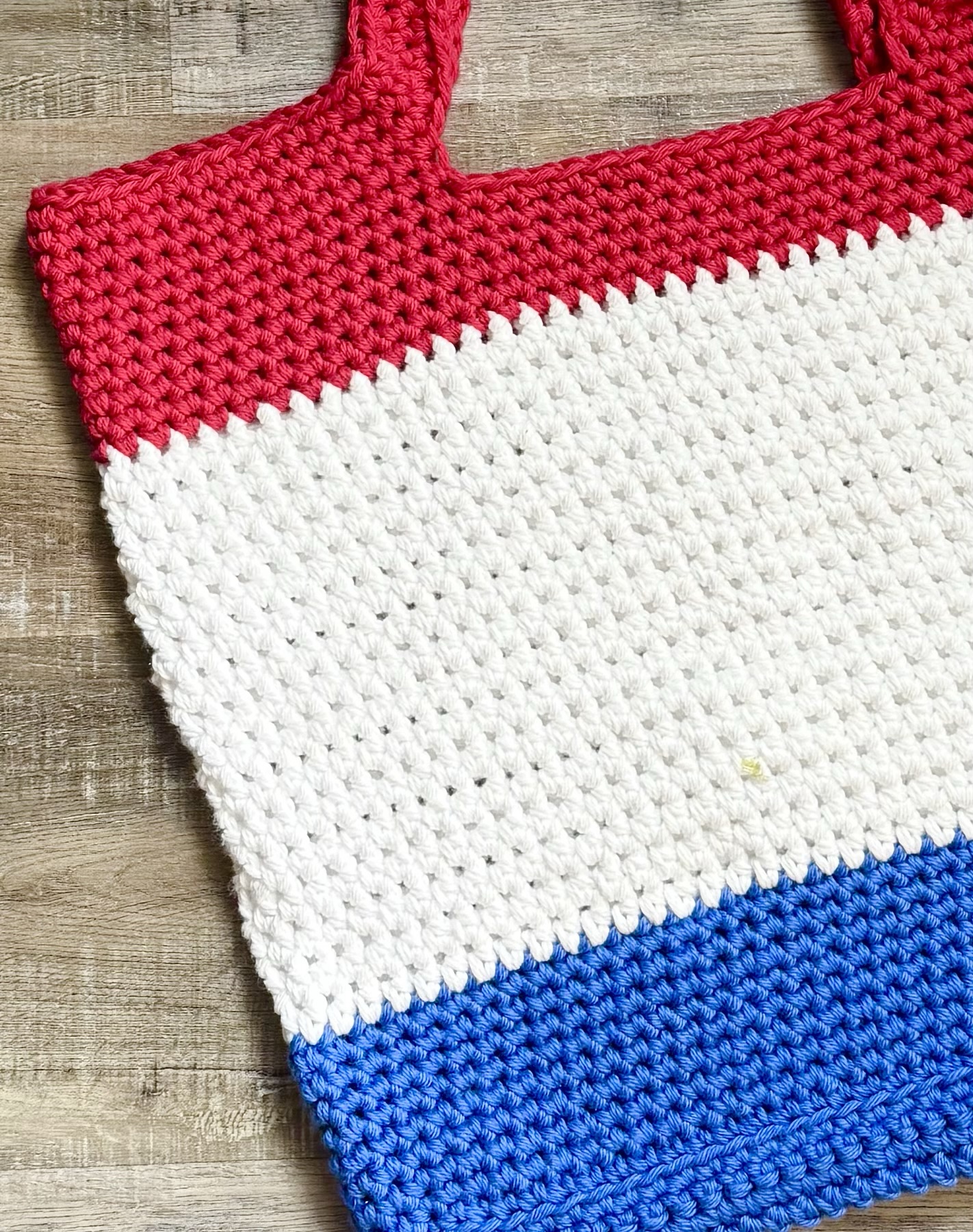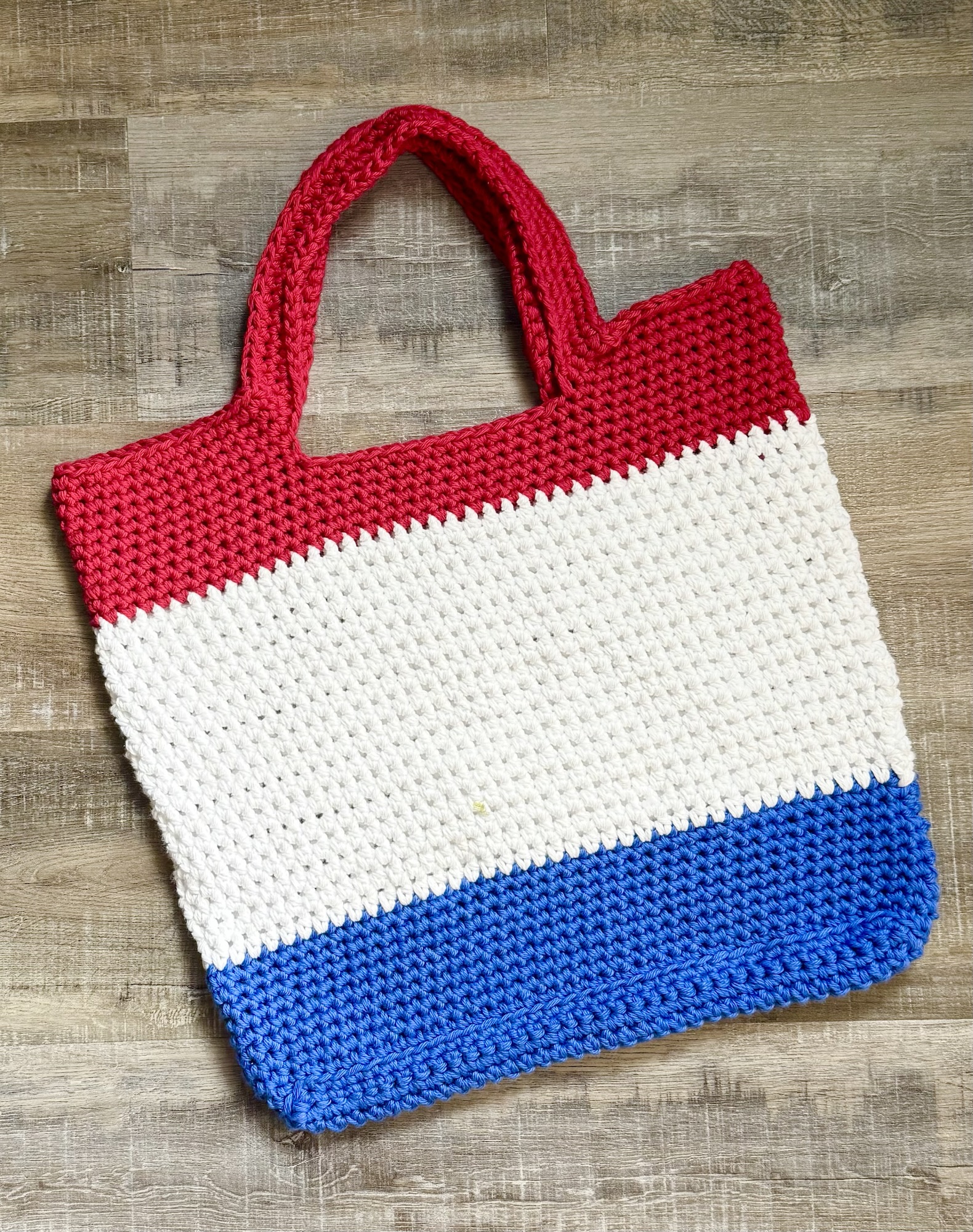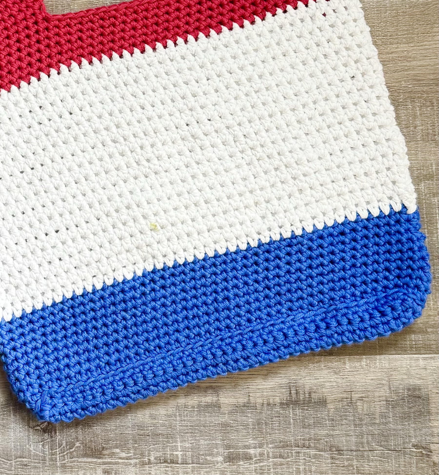 I used I Love This Cotton Yarn in Red, White, and Royalty with an N/9mm crochet hook to stitch up my Summer Tote Bag. You can find the pattern below along with a link to a free PDF if you’d like to easily print it. There is also a link to a free PDF without photos if you would prefer that.