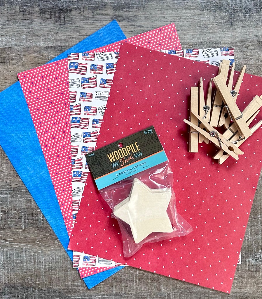 Using E6000 clear adhesive, apply a thin line of glue to the star and attach it to the clothespin. If your scrapbook paper has a pattern that needs to go a certain way, make sure that you check your star before glueing it to your clothespin! You can see that I didn’t pay attention to that on one of my flag stars in the photo. And let me just say that the E6000 clear adhesive will hold that star to the clothespin forever once it’s dry!!😮 I could not get it off to turn it the right way!