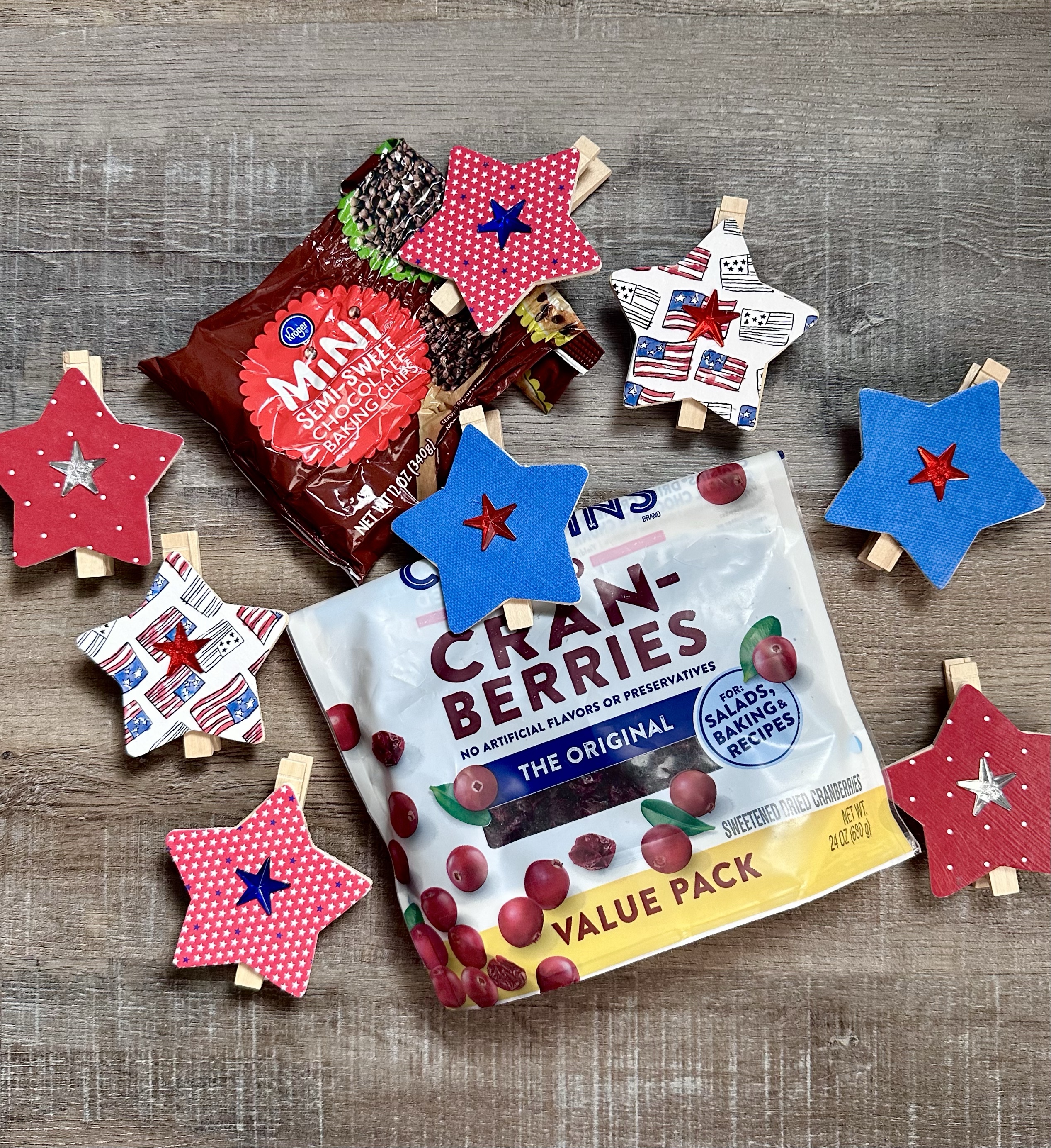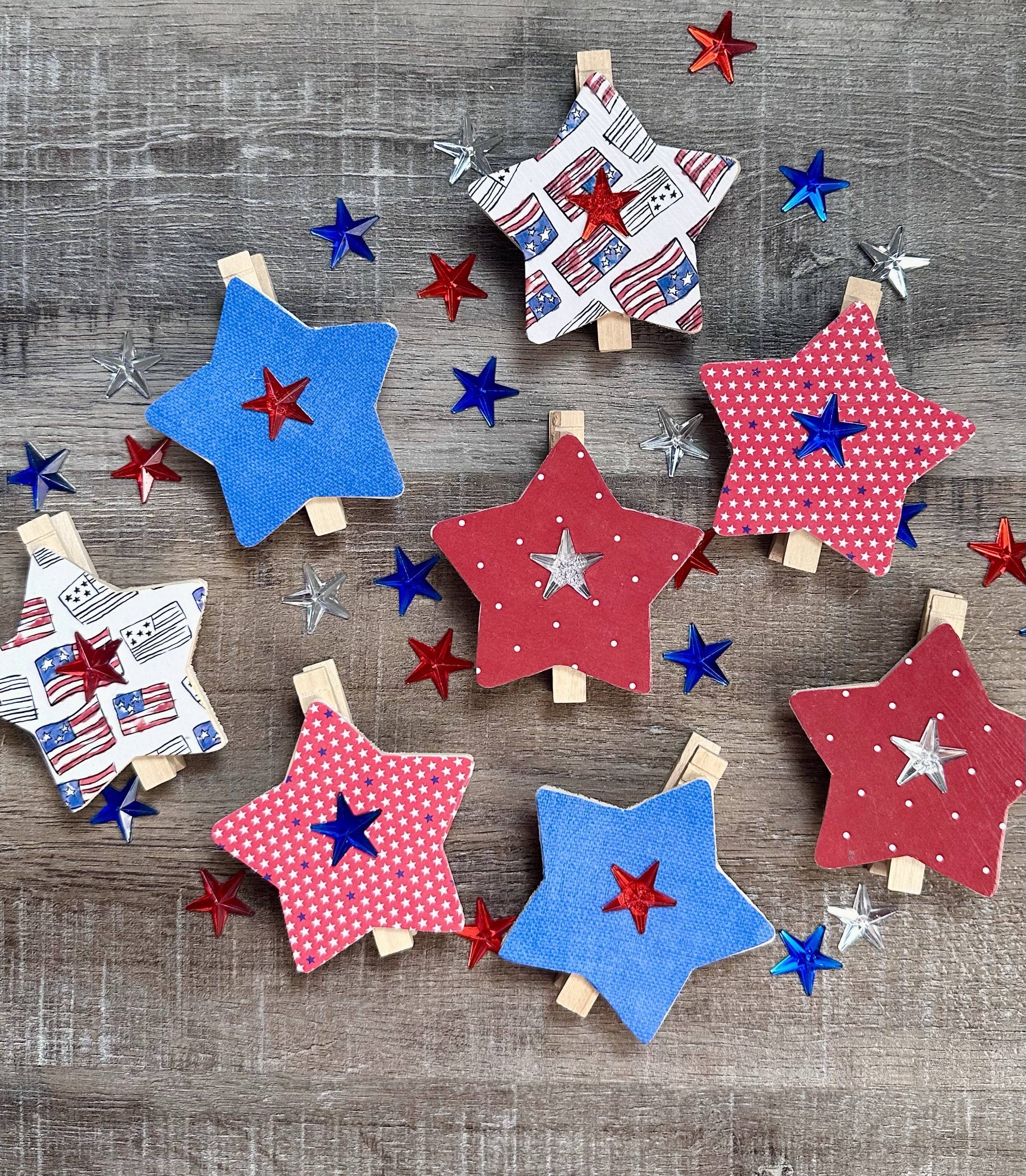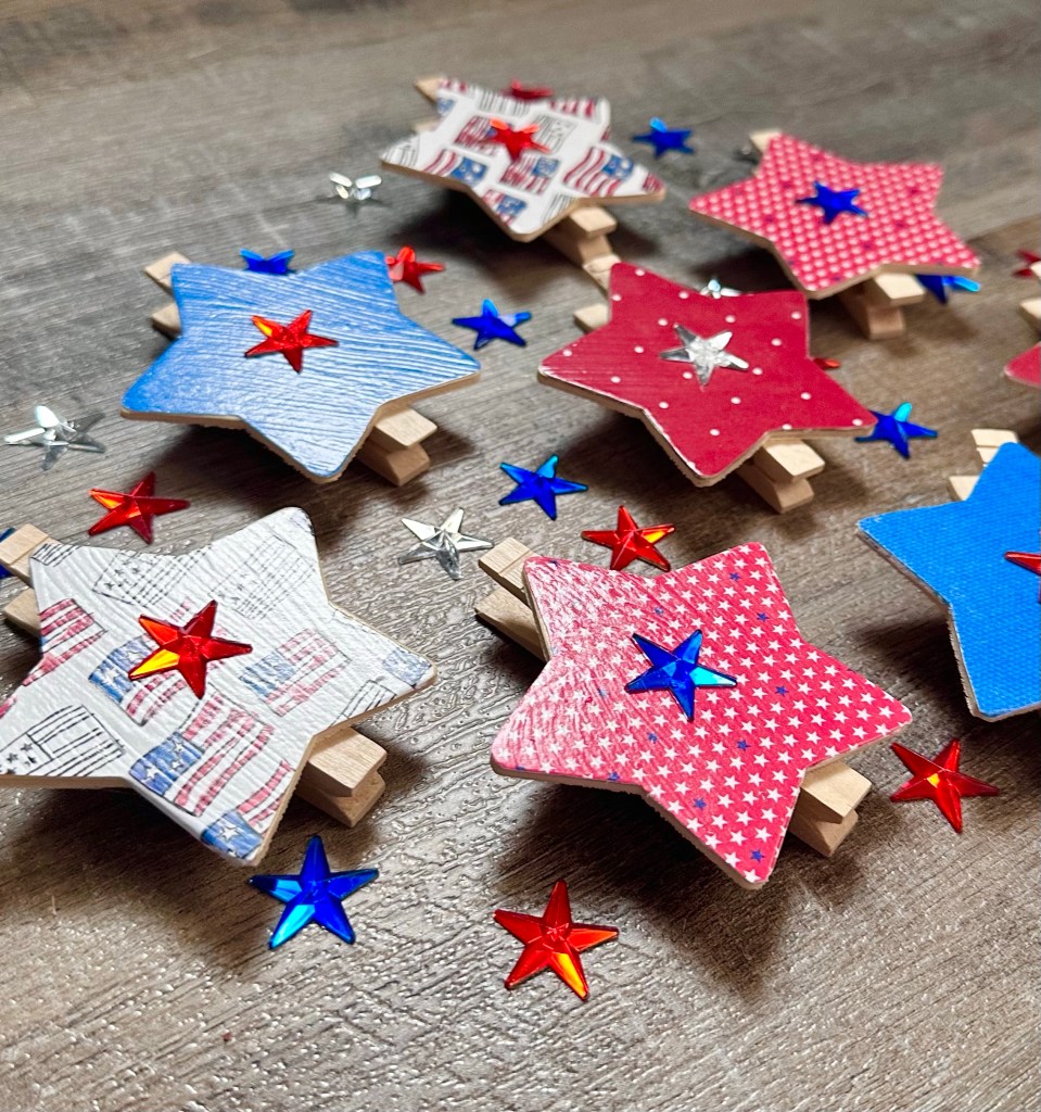 I found the cute little red, blue, and clear stars in the seasonal section at Hobby Lobby. I used E6000 clear adhesive to attach a little star to each clip. This is optional, but I really like the extra little bling they add. 🙂